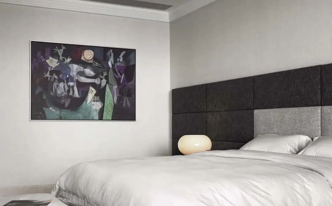 床尾的柜子上放置着两幅艺术家李林祥的画作,以普通的PVC管道简单穿插,完成对于日常生活的重置,引导着人去关注平凡之物,和刻印其中的时间的痕迹。床的另一侧是毕加索《在昂蒂布的夜间捕鱼》的版画。