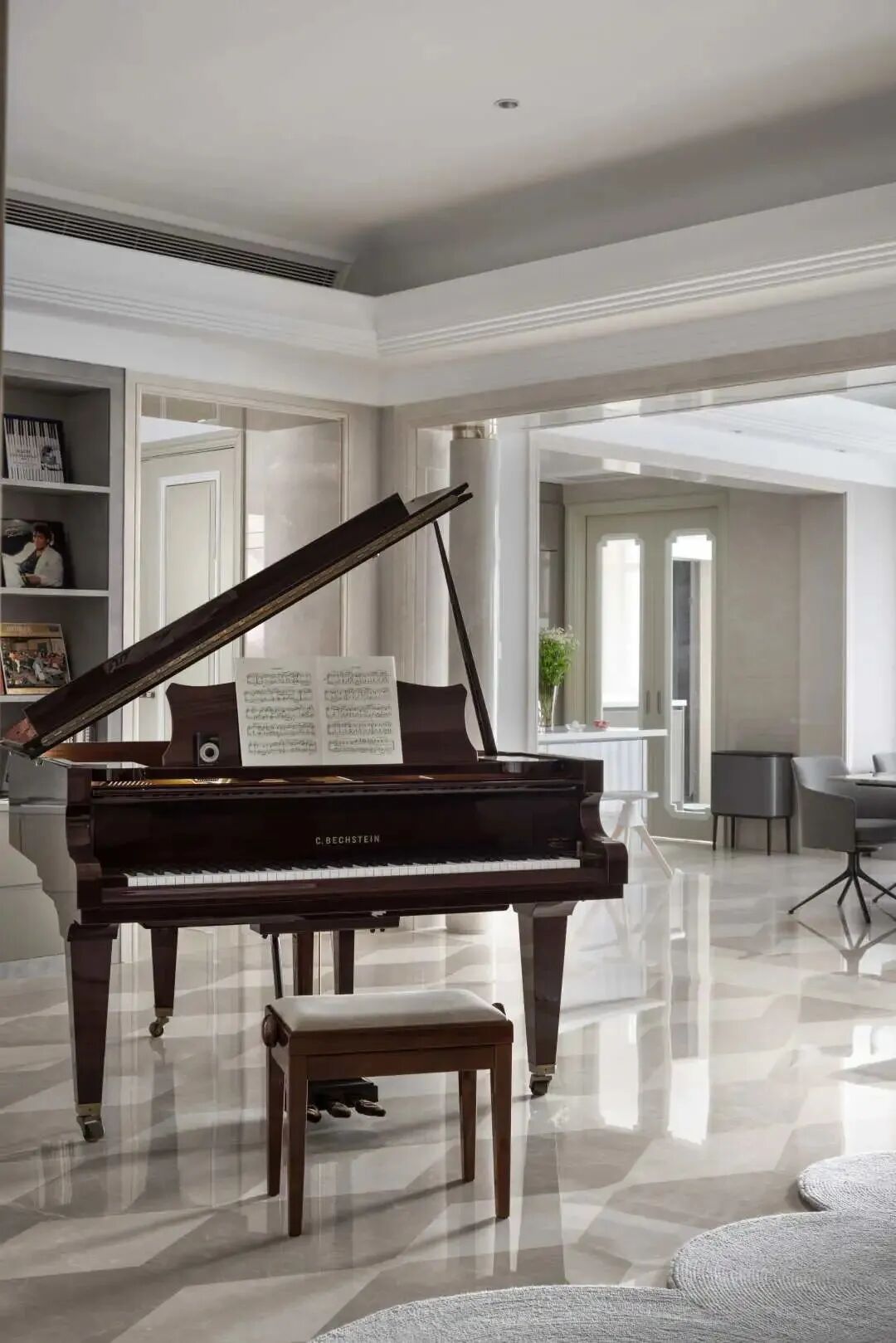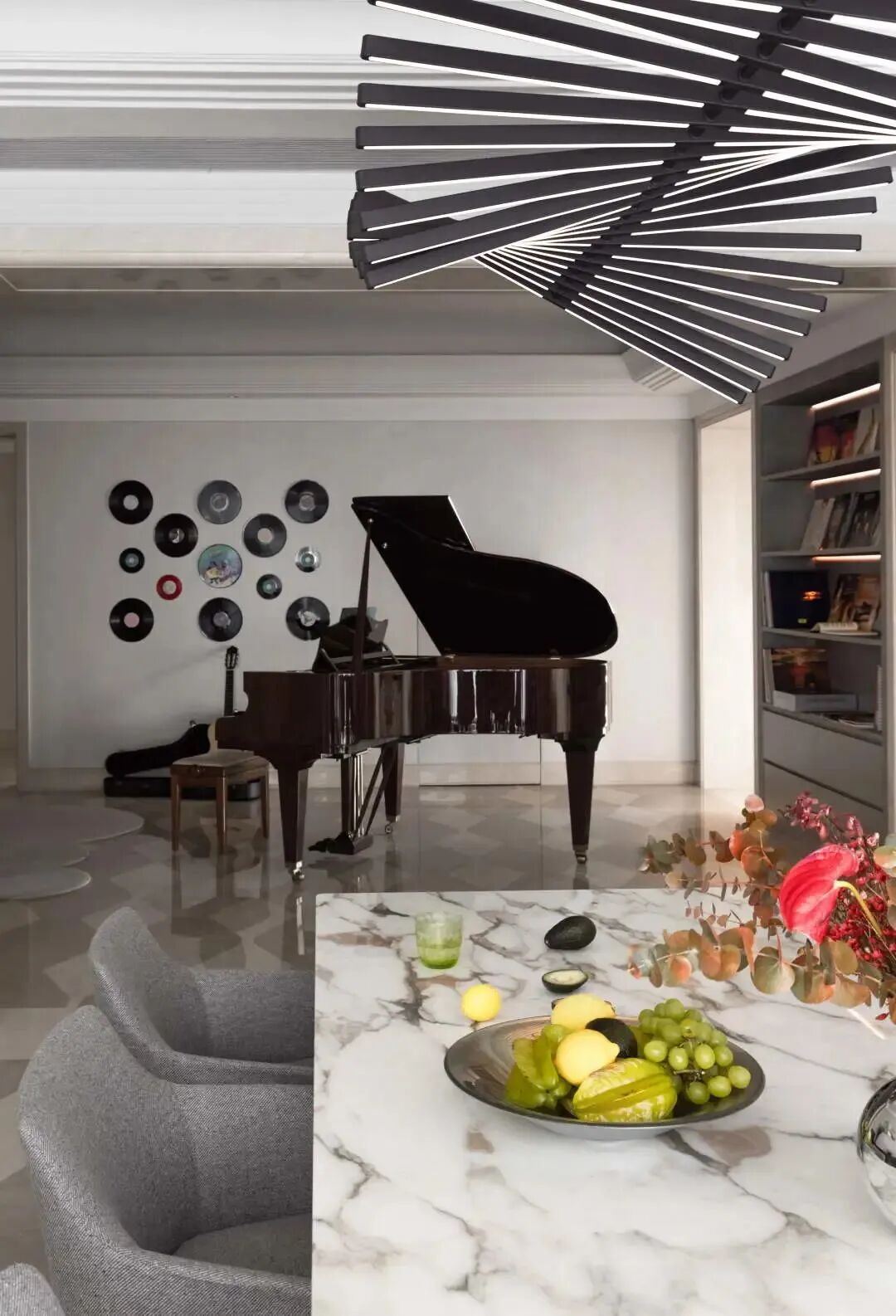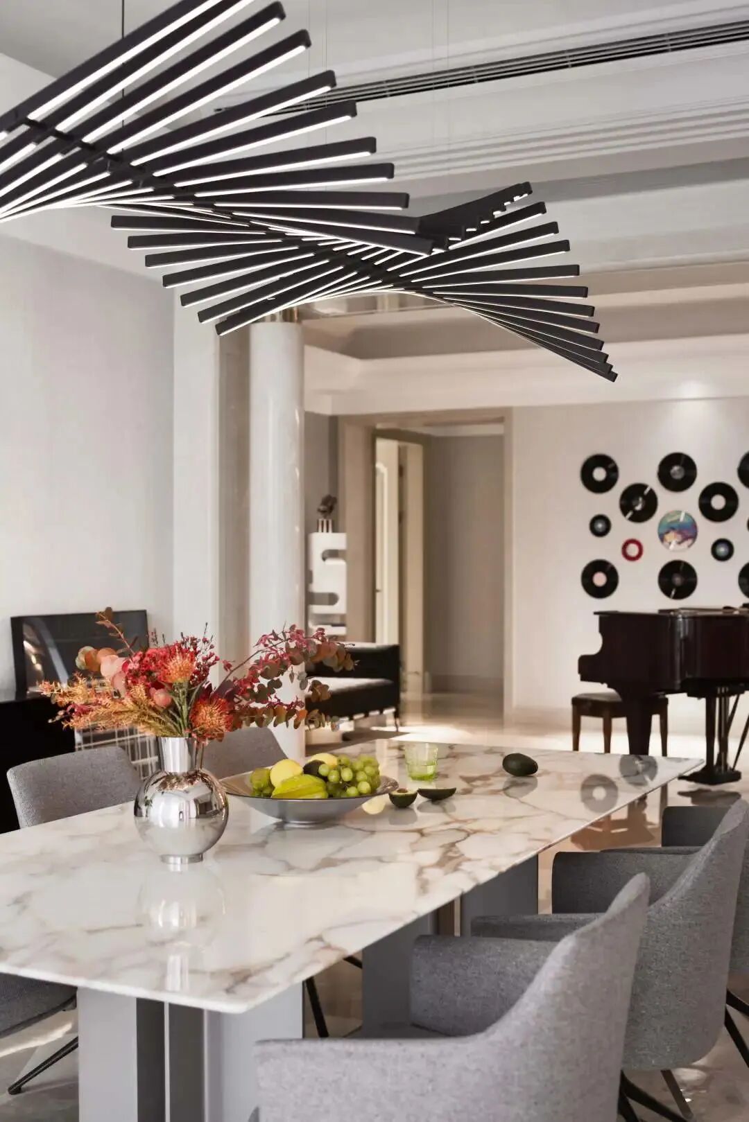 空间随脚步而流转,玄关与钢琴曲,成为整个家的“序曲”,空间由此缓缓展开。一架C.BECHSTEIN的古典钢琴对面摆放的是一个充满现代机械感reflex的餐边柜,黑白键从钢琴一直流动到餐桌上方,vibia的吊灯与琴键遥相呼应。