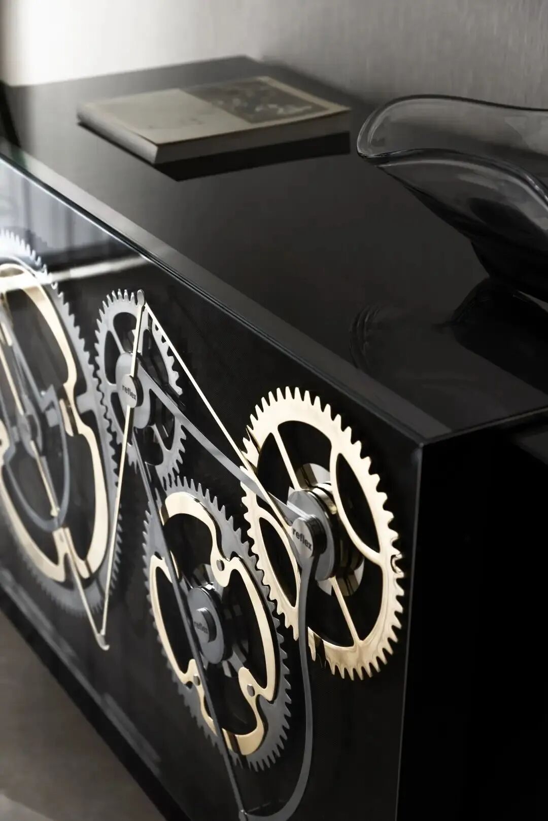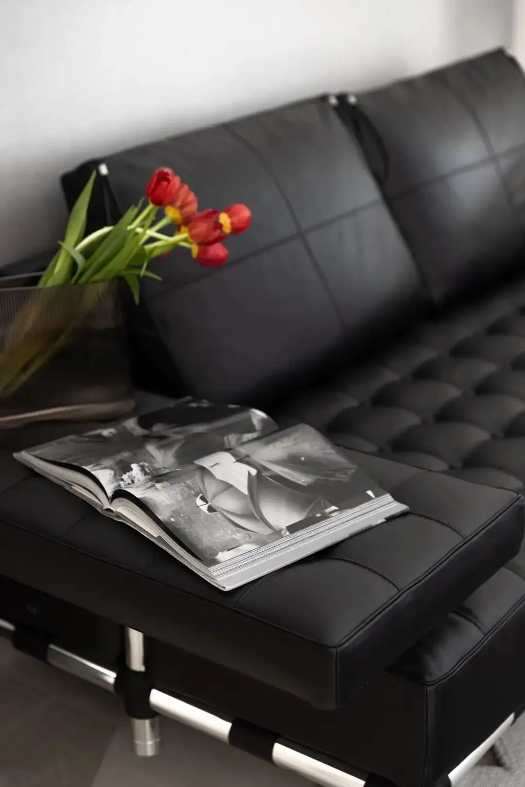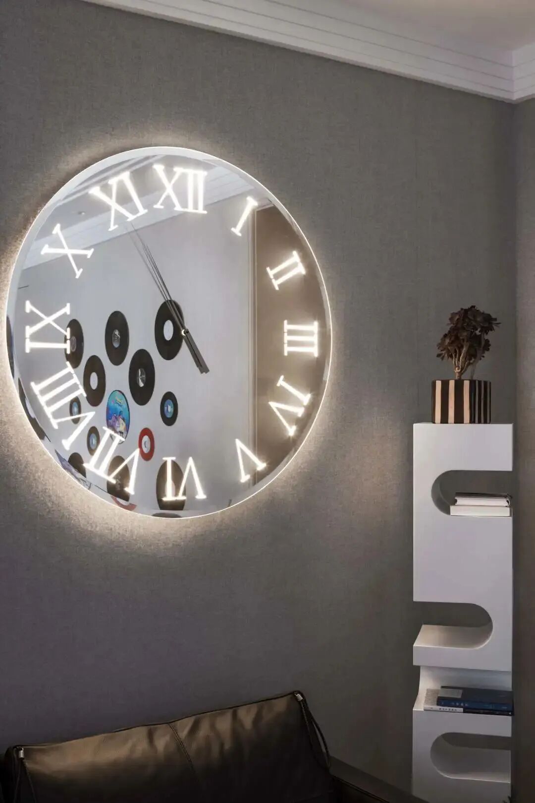 黑色沙发来自Philippe Starck的设计,Reflex TITANIUM SPECCHIO钟表镜子让空间得以延伸,它的表面使用了罗马数字,但材质和款式都是现代设计手法,又一次古典与现代时空碰撞对话。随着时间的流逝,家恒久不变,大小物件皆是自己喜欢的。