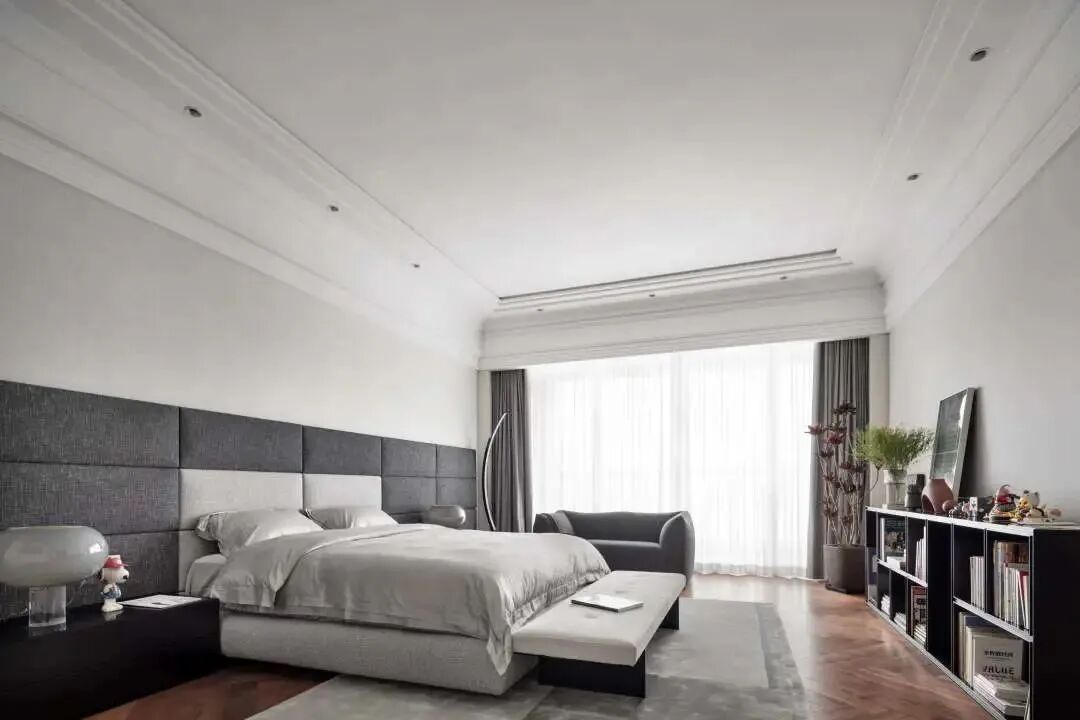 作为一个长方形的超大房间,Vivian选用了poliform的超长靠背拼接床,拉伸整体的空间感,也为卧室注入一种沉稳感。