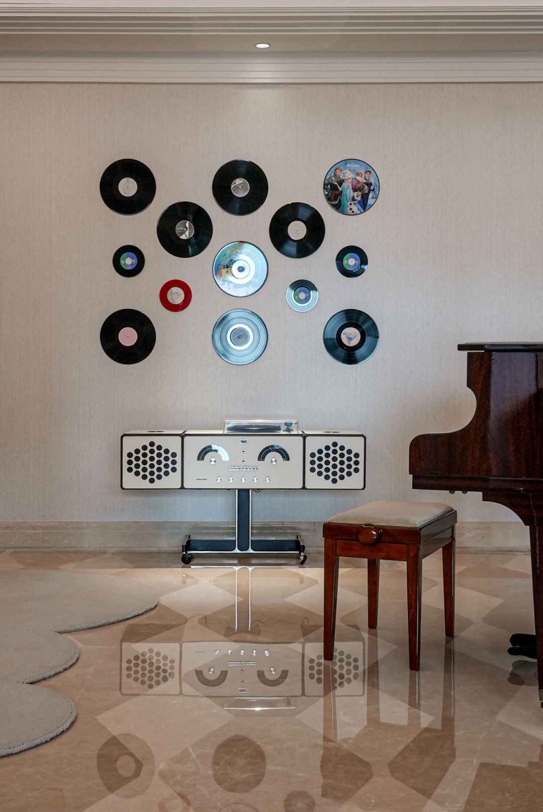 吉他上面的黑胶墙是Vivian从凡凡海量收藏中拿出来的“冰山一角”,陈列在墙上,物与人对话,心获得归属,最细节中是最独特的韵味。这把吉他也大有来头,是世界顶级品牌阿尔罕布拉Alhambra最高级别的大师手工古典吉他,它拥有无比清脆的音色,令人着迷。