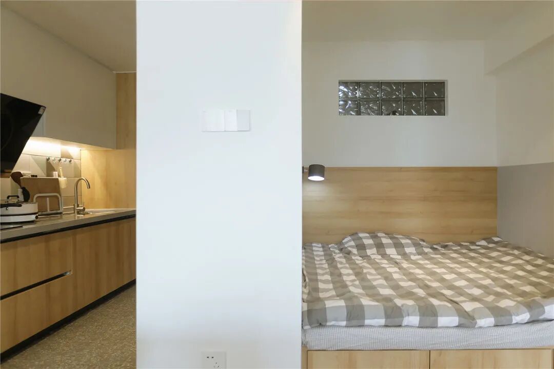 新建隔墙后,围塑了一个相对私密的空间,定制榻榻米床变成卧室。床头左侧墙面预留设计小壁龛,充当床头柜使用。床头上方铺设一道玻璃砖,为暗卫引入自然光线。