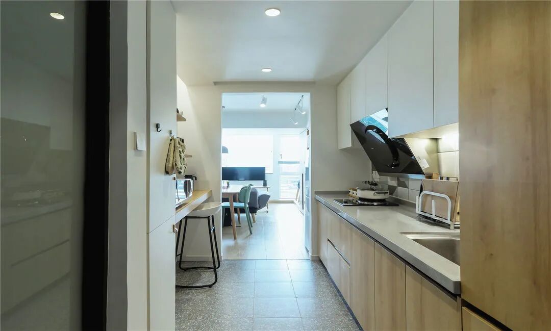 原本开阔的空间,在新建隔墙后私密性变得更好。入户空间与厨房结合,走道动线和空间的叠加利用,极大的提高了空间利用率,对于小户型来说再合适不过了。