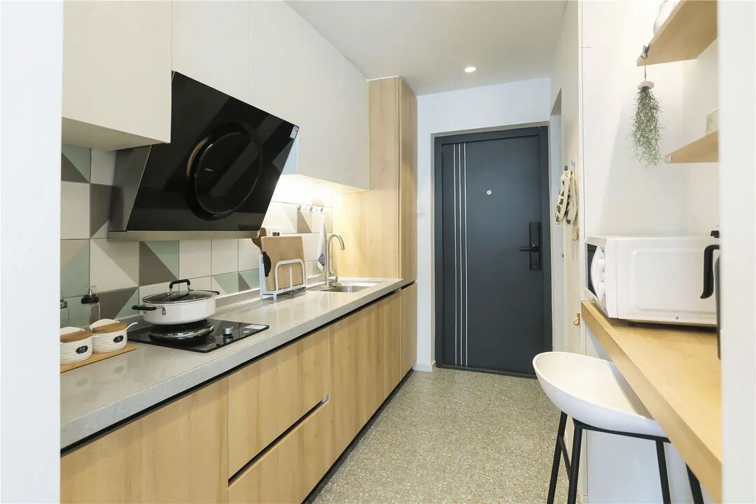 一字形厨房设计,上下两排收纳柜,提供了足够的储物空间。靠近入户门,设计了一面到顶鞋柜,满足日常对鞋子的收纳。木质元素与橱柜保持一致,简洁自然视觉效果更具统一感。