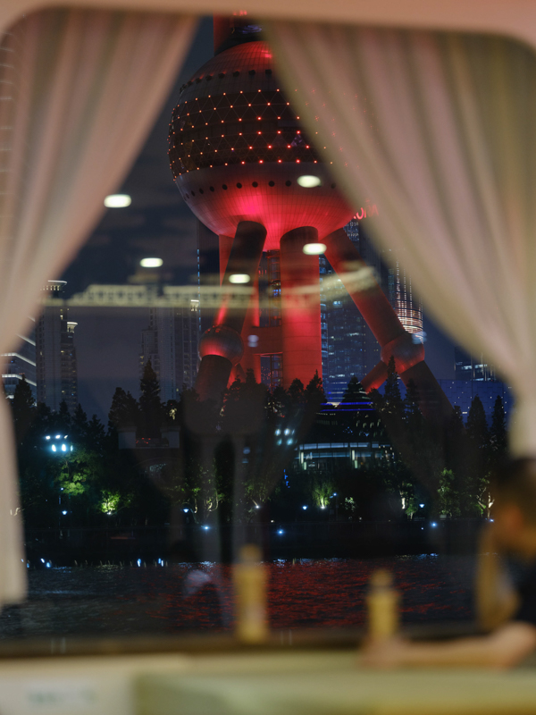 黄浦江的游船上,窗外东方明珠看起来有点陌生,既不像平时看那样,远处看像一根小小的糖葫芦,也不像站在近处,压下来挡住高耸入云的部分。另一处,红衣男人用手机摄像头给家人看不远处的东方明珠。挂了电话,他和身边工友讨论,东方明珠看上去很近,但从所在的北外滩过去,要不要过黄浦江呢,走路又能走到吗……