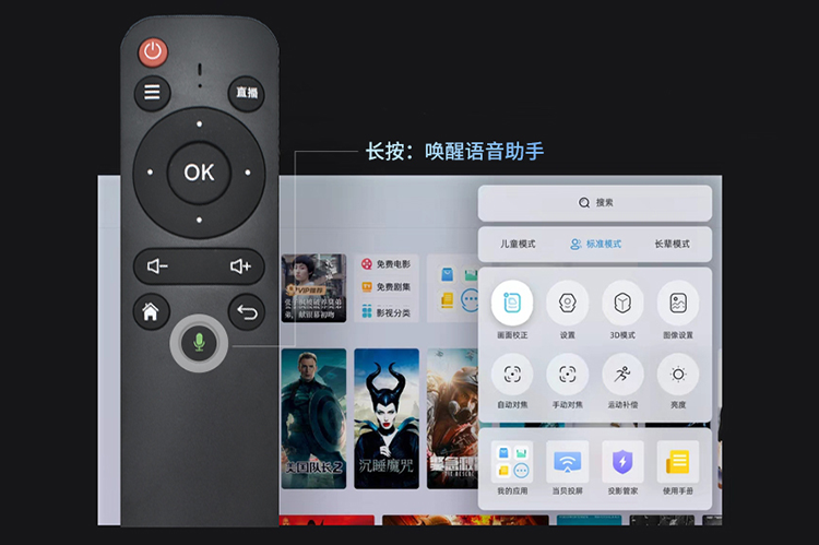 支持语音遥控 | 这款投影仪还配备了AI智能语音遥控,语音操作只需要动动嘴,家里老人小孩都能快速上手,so easy~