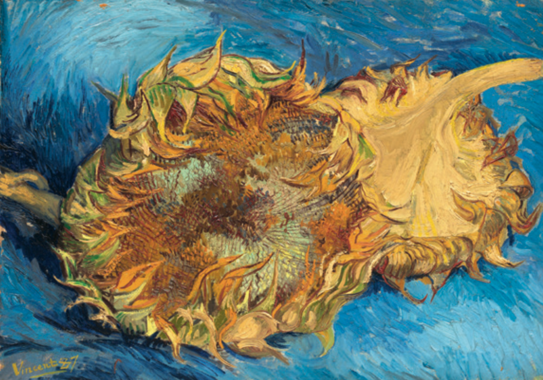 高更也确实教会了梵高很多艺术常识,比如如何最大限度地利用他们现有的画布,或是使用他自己找到的更便宜的粗麻布。两人或是一起外出写生,或是一起在室内作画,梵高的生活和向日葵绚烂温暖的颜色一样变得好起来了。