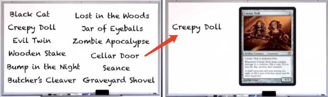 比如,在2011年-2012年「依尼翠:黑影笼罩」版本,团队定下「哥特式」主题后,他们开始围绕主题,不设限地畅想各种一听就很酷炫的词条——坟墓场土铲、林间迷途、可怖娃娃、半夜响声——塞到白板上。这些词条在后续变成了各色有趣的卡牌。