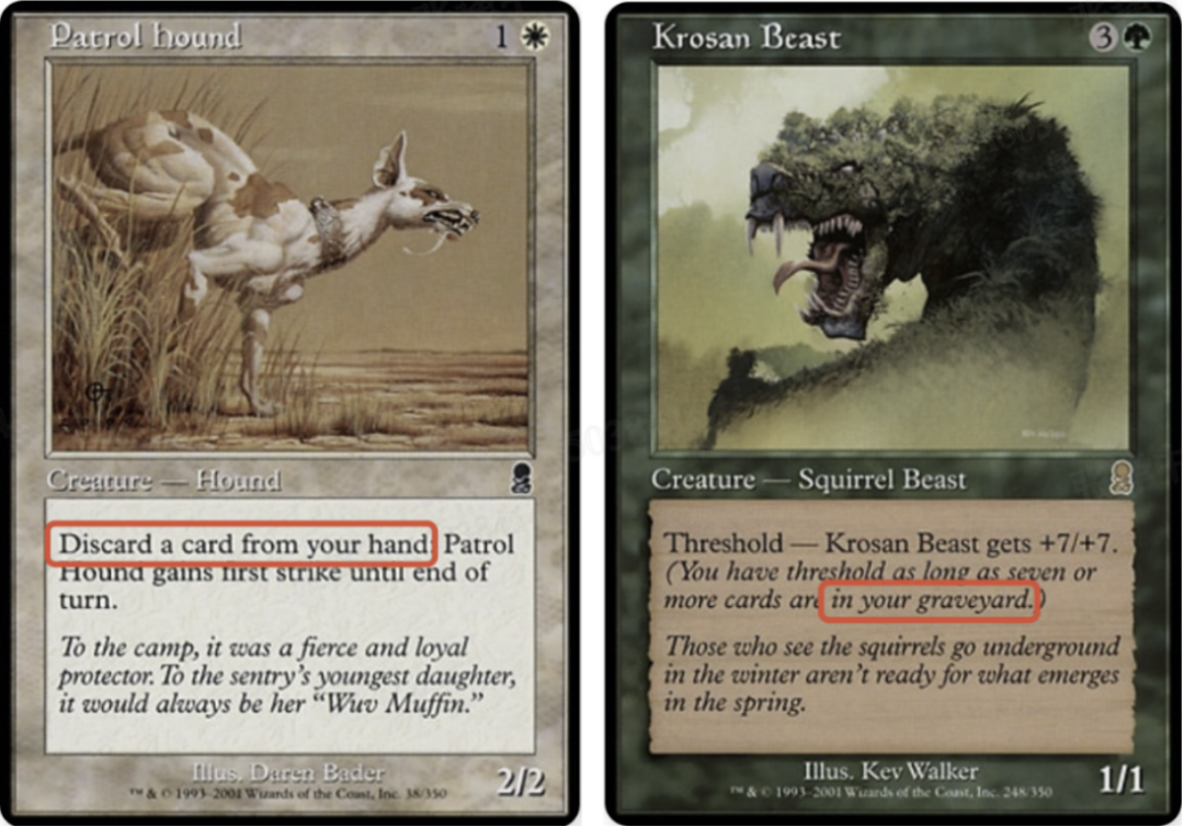 在2006年「时间漩涡」版本中,《万智牌》推出了弃牌机制:通过不断丢弃卡牌,堆积墓地,一些场上卡片会触发强力效果。MaRo和团队起初觉得这是一个很棒的点子,因为不同于过去手牌和场面的博弈,它将墓地也开发成了博弈点,丰富了游戏策略,概念新颖,逻辑自洽。