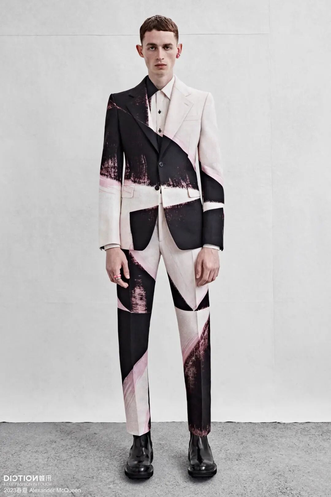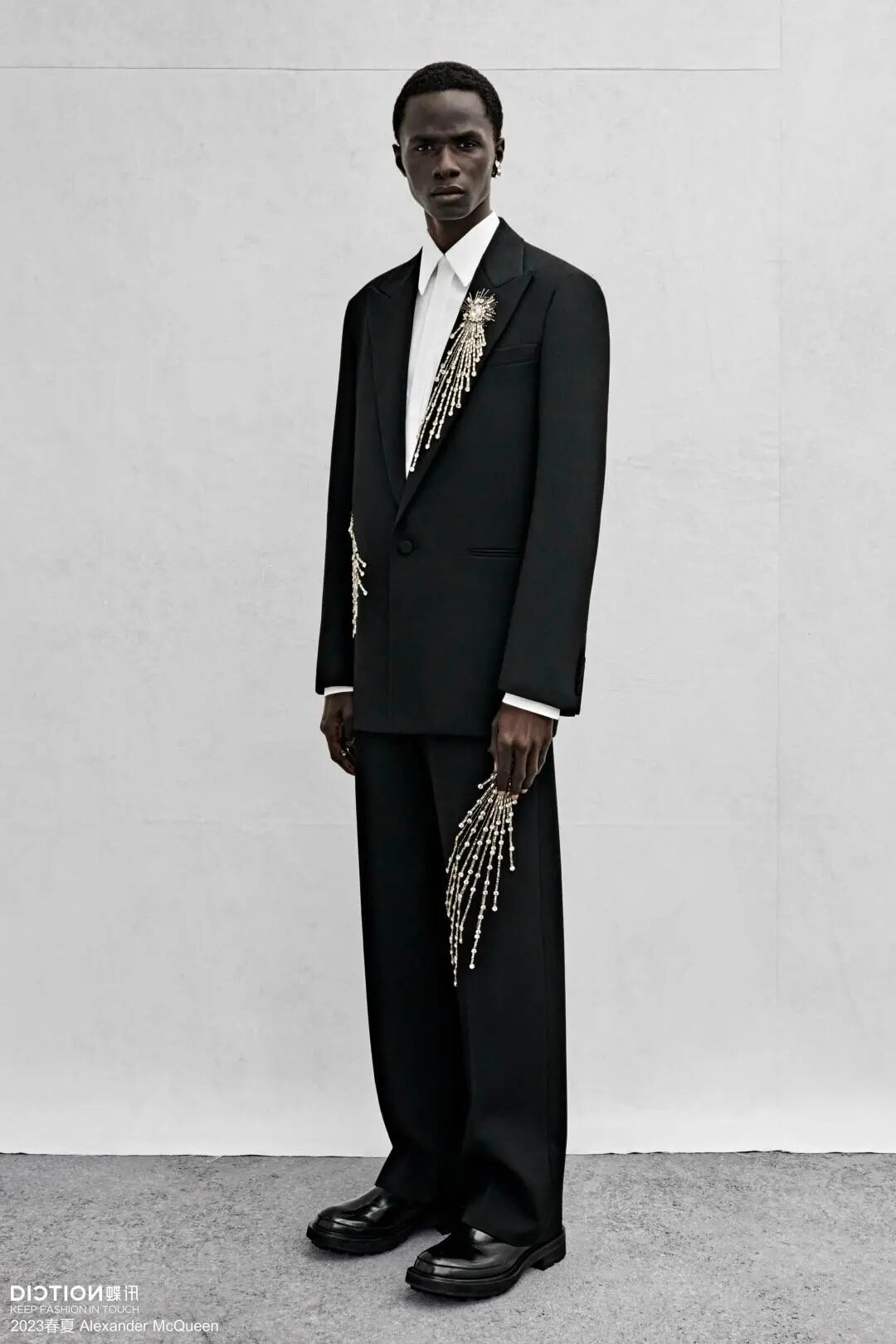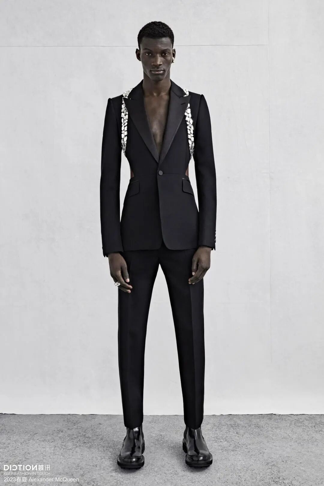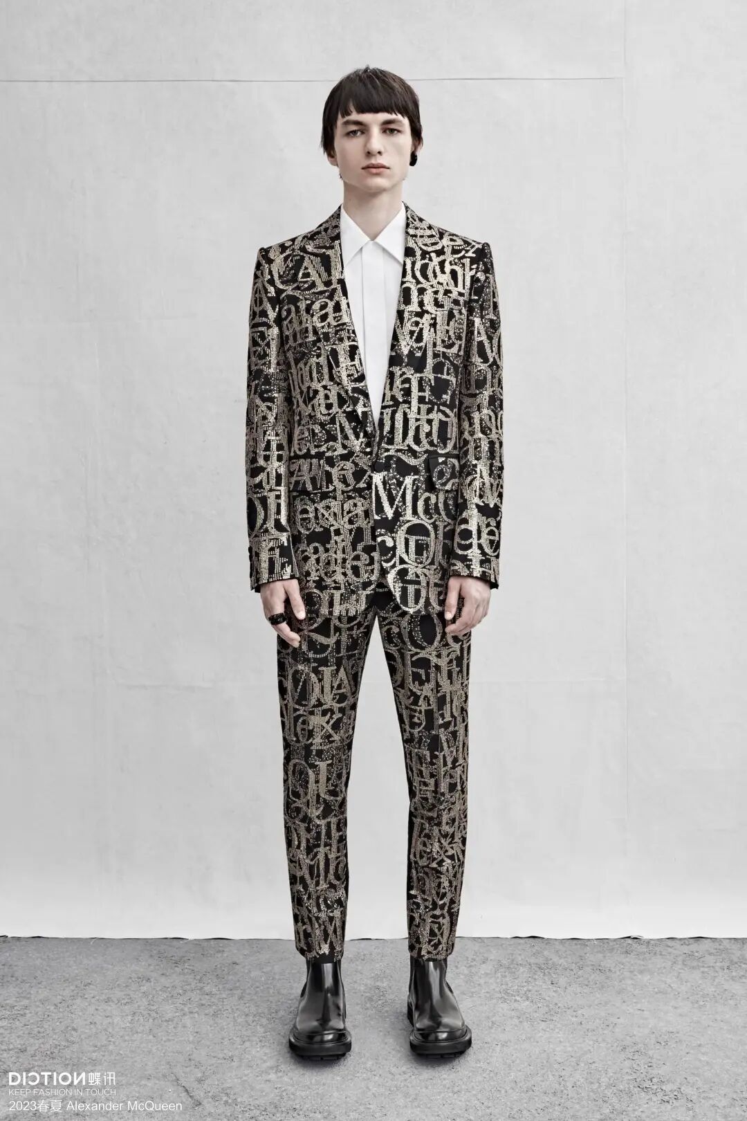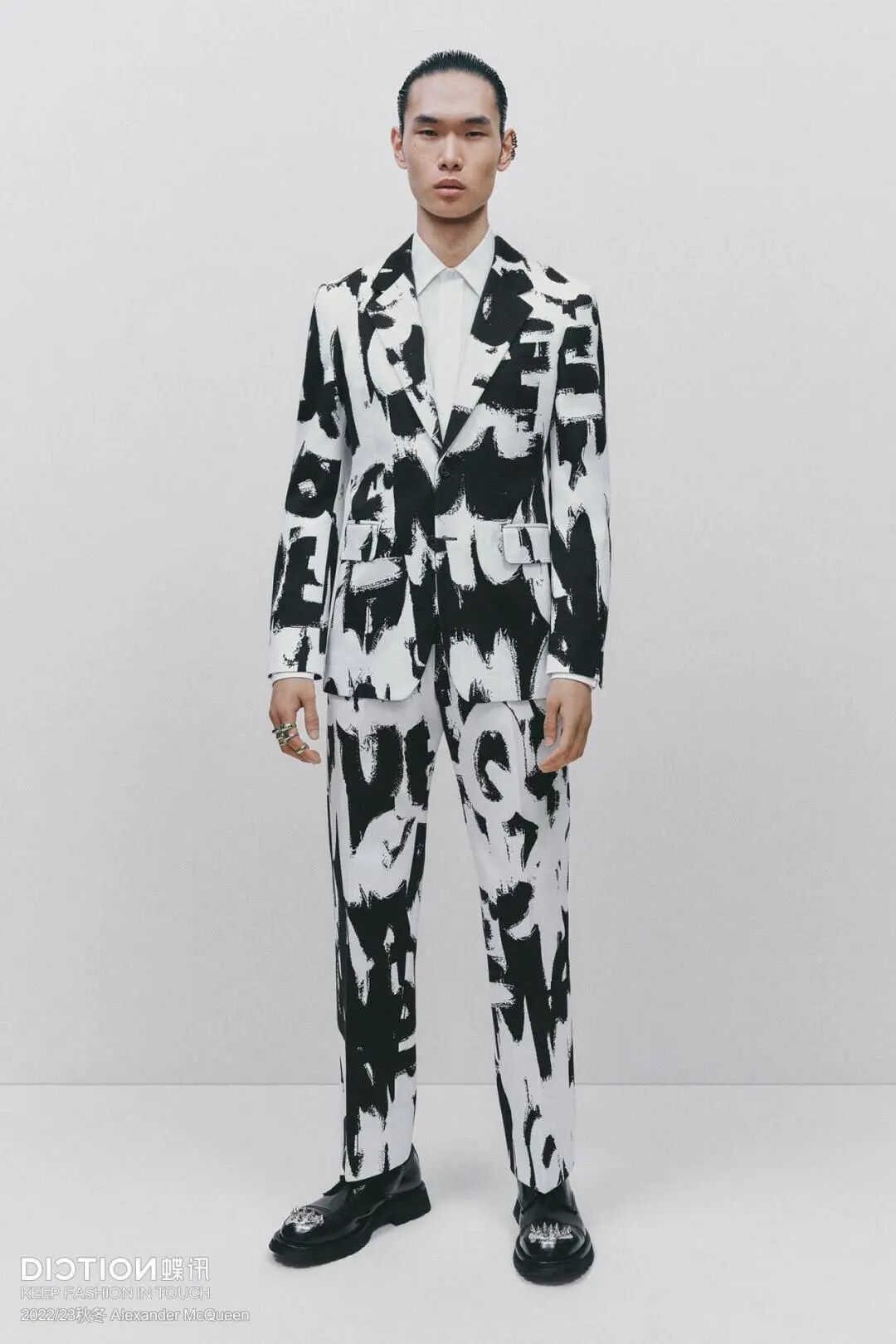 整个系列以黑白色调为主,中间穿插了泼墨、几何和字母元素,而皮革、牛仔丹宁等材料也丰富了本季的材质。整个系列运用利落干练的剪裁呈现出完美廓形,在细节上点缀金属材质与水晶装饰,让整体充满高级质感的同时又不失设计感,塑造出一个个贵气笔挺的麦昆男孩。