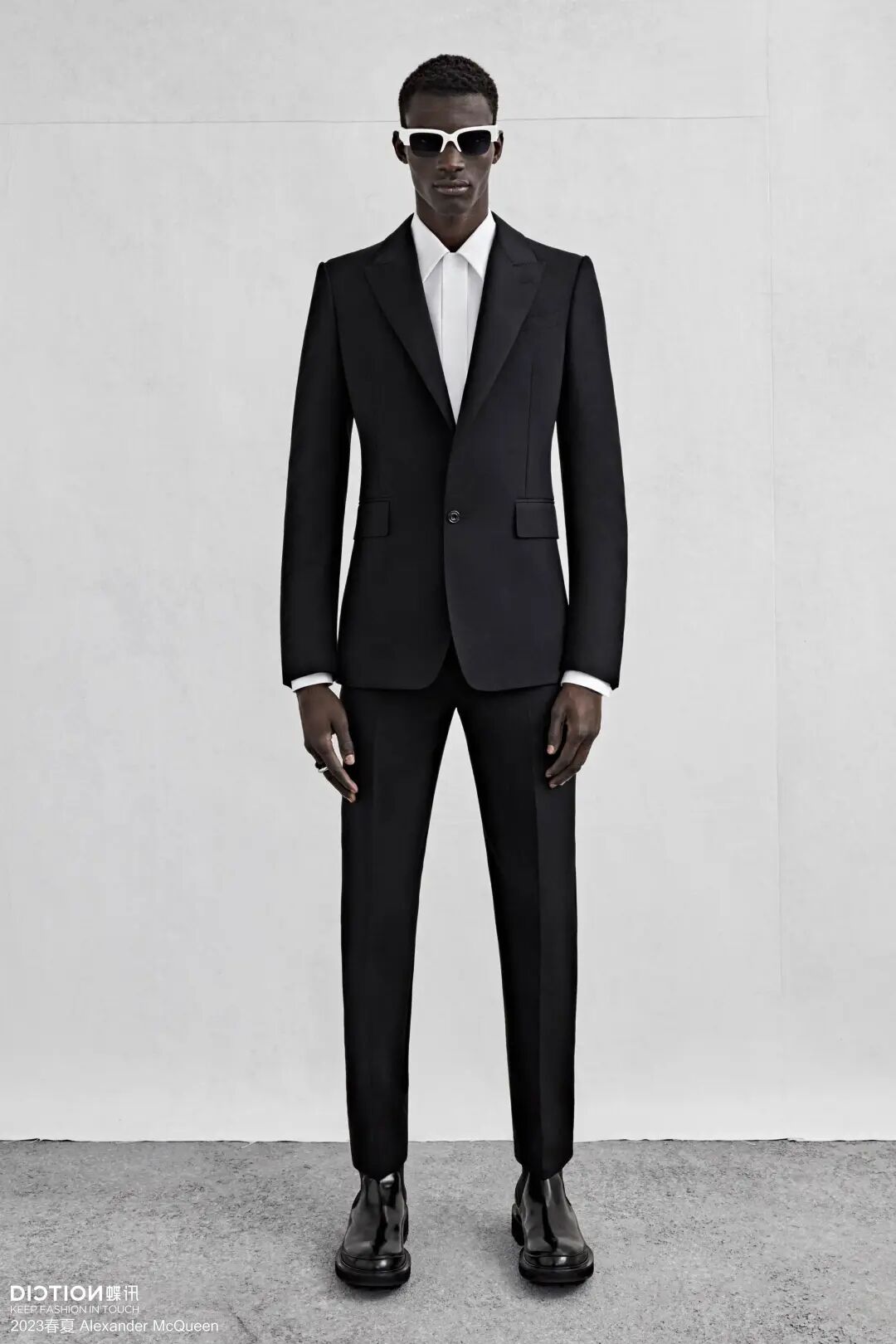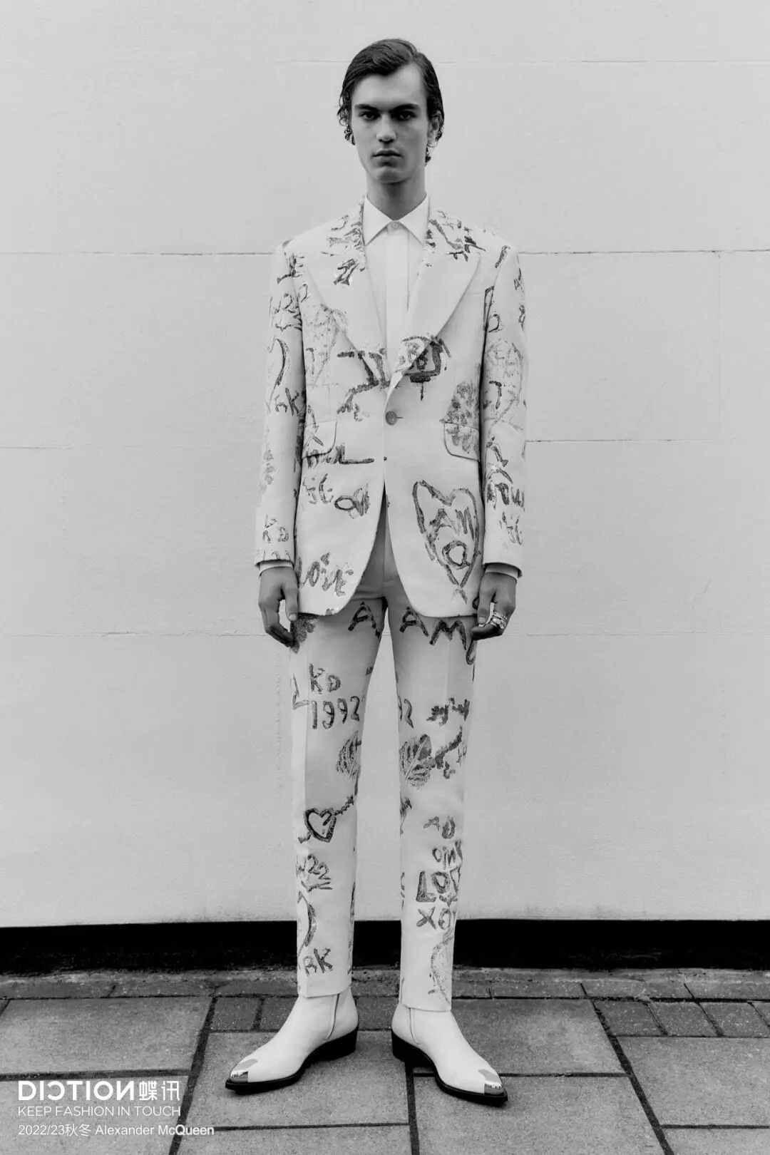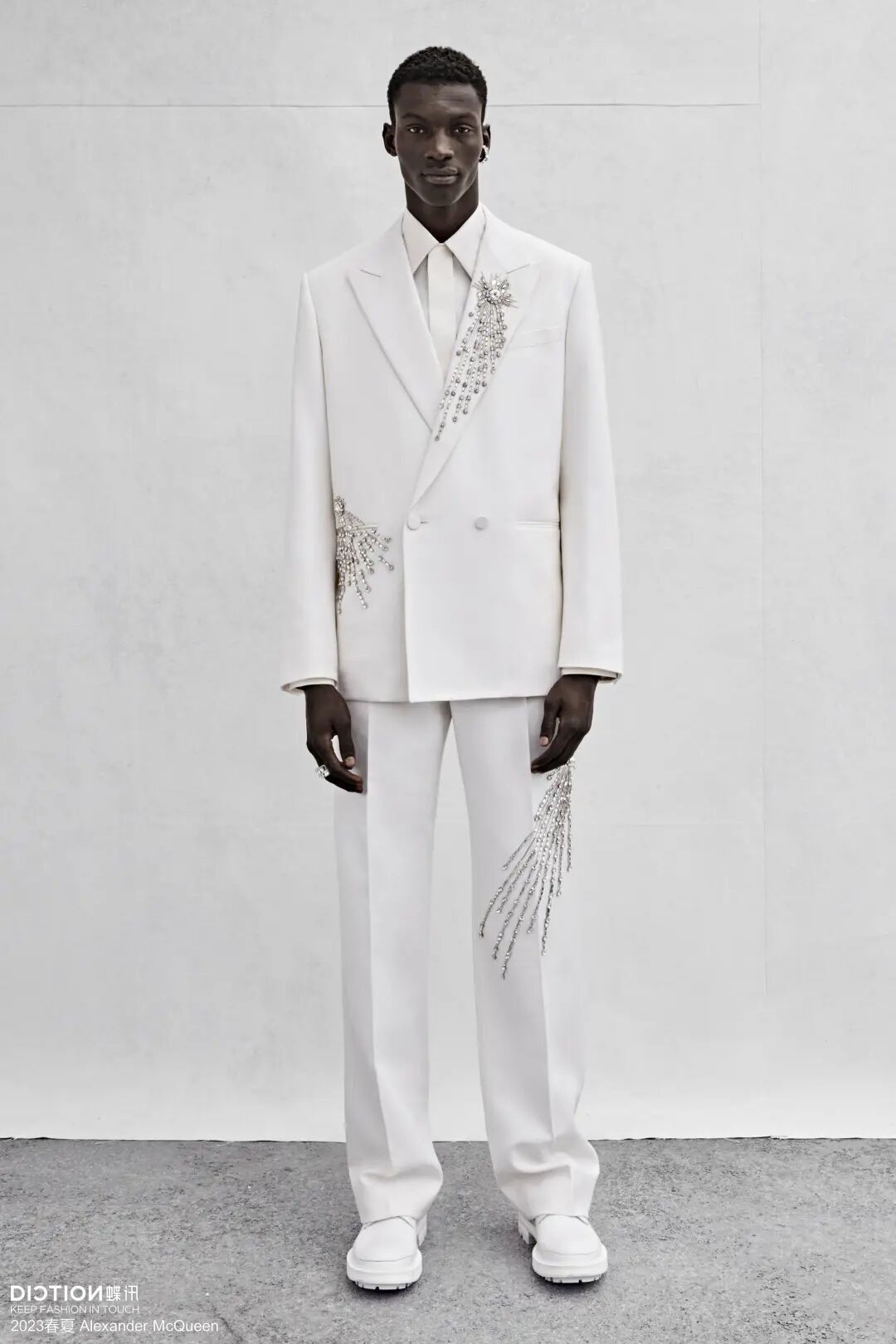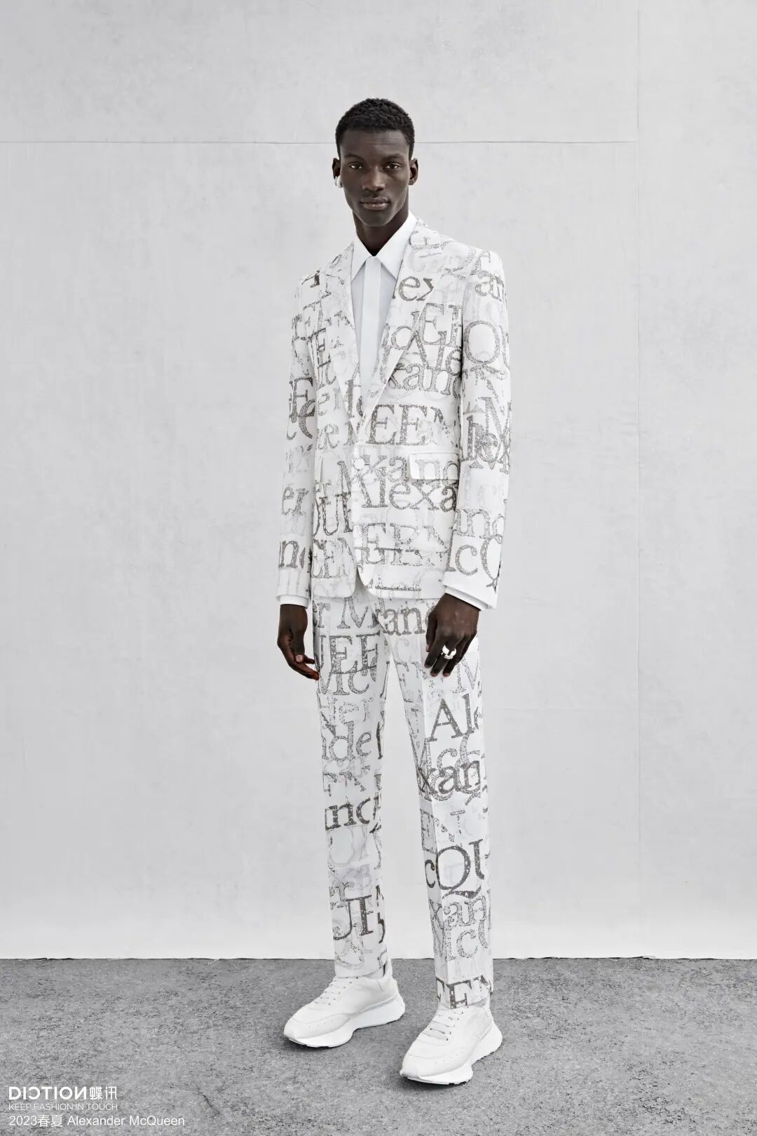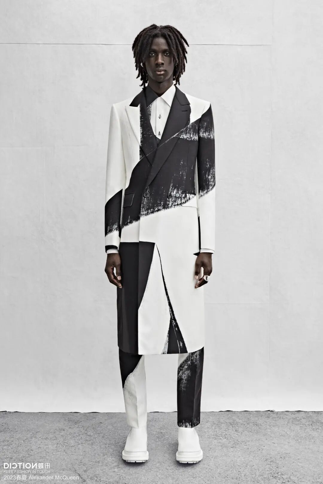 整个系列以黑白色调为主,中间穿插了泼墨、几何和字母元素,而皮革、牛仔丹宁等材料也丰富了本季的材质。整个系列运用利落干练的剪裁呈现出完美廓形,在细节上点缀金属材质与水晶装饰,让整体充满高级质感的同时又不失设计感,塑造出一个个贵气笔挺的麦昆男孩。