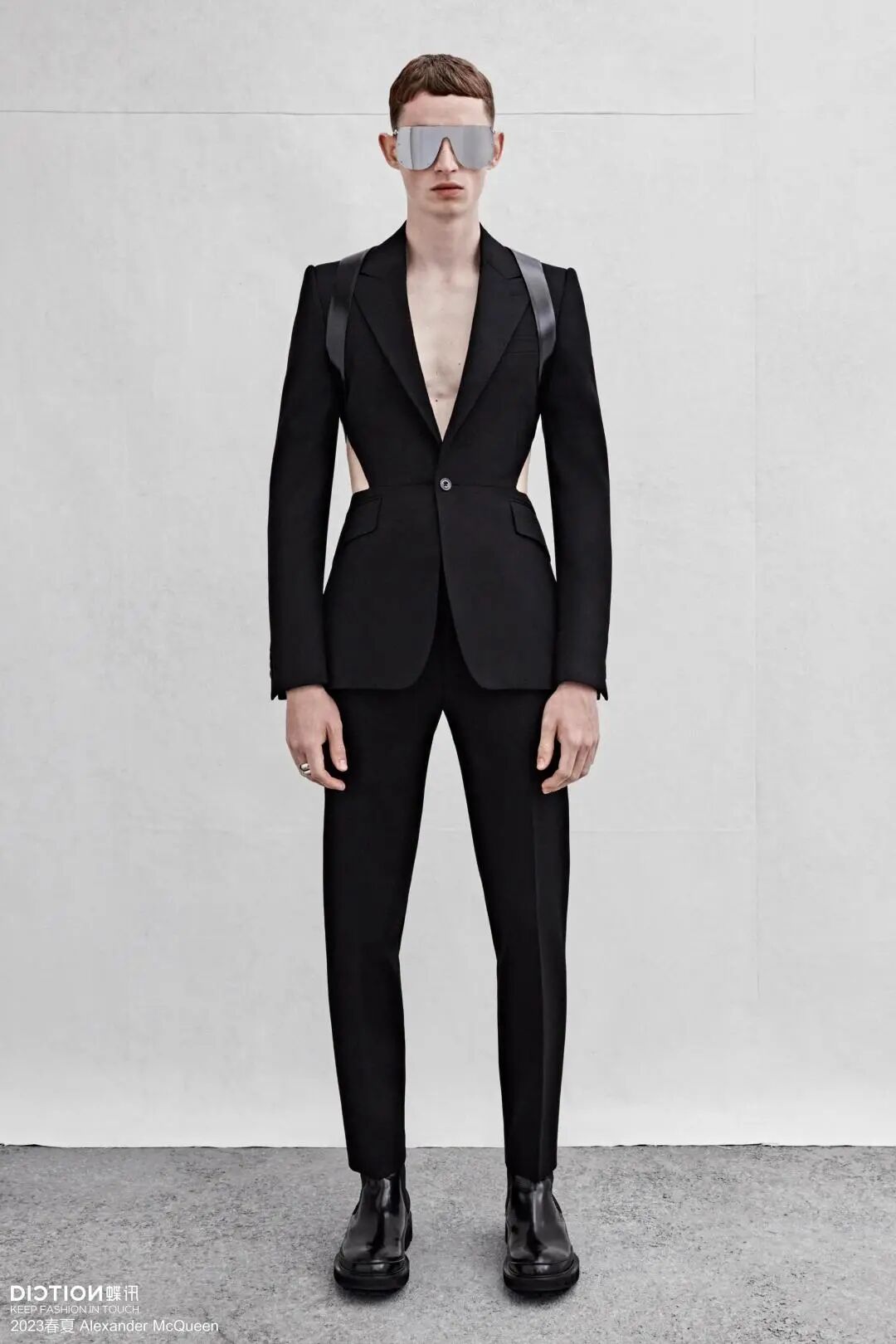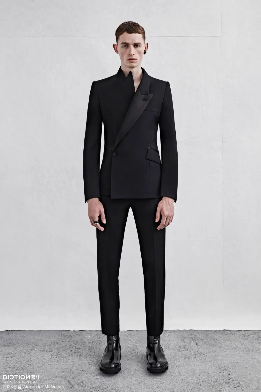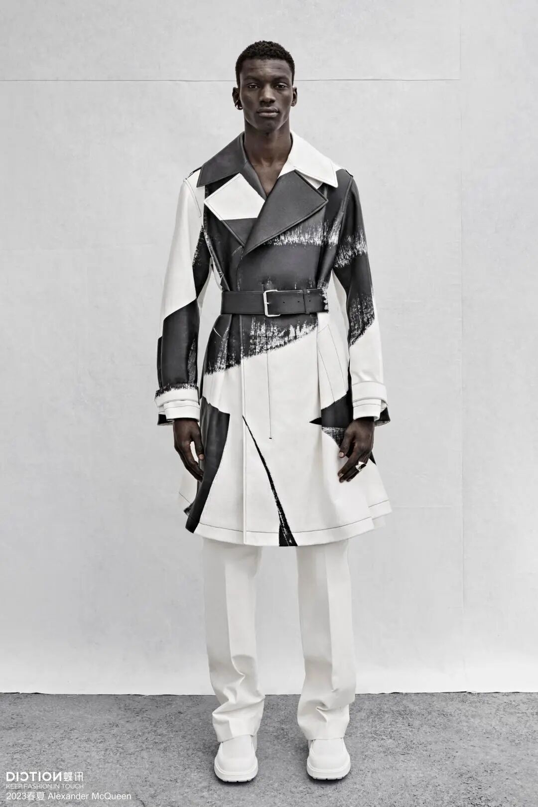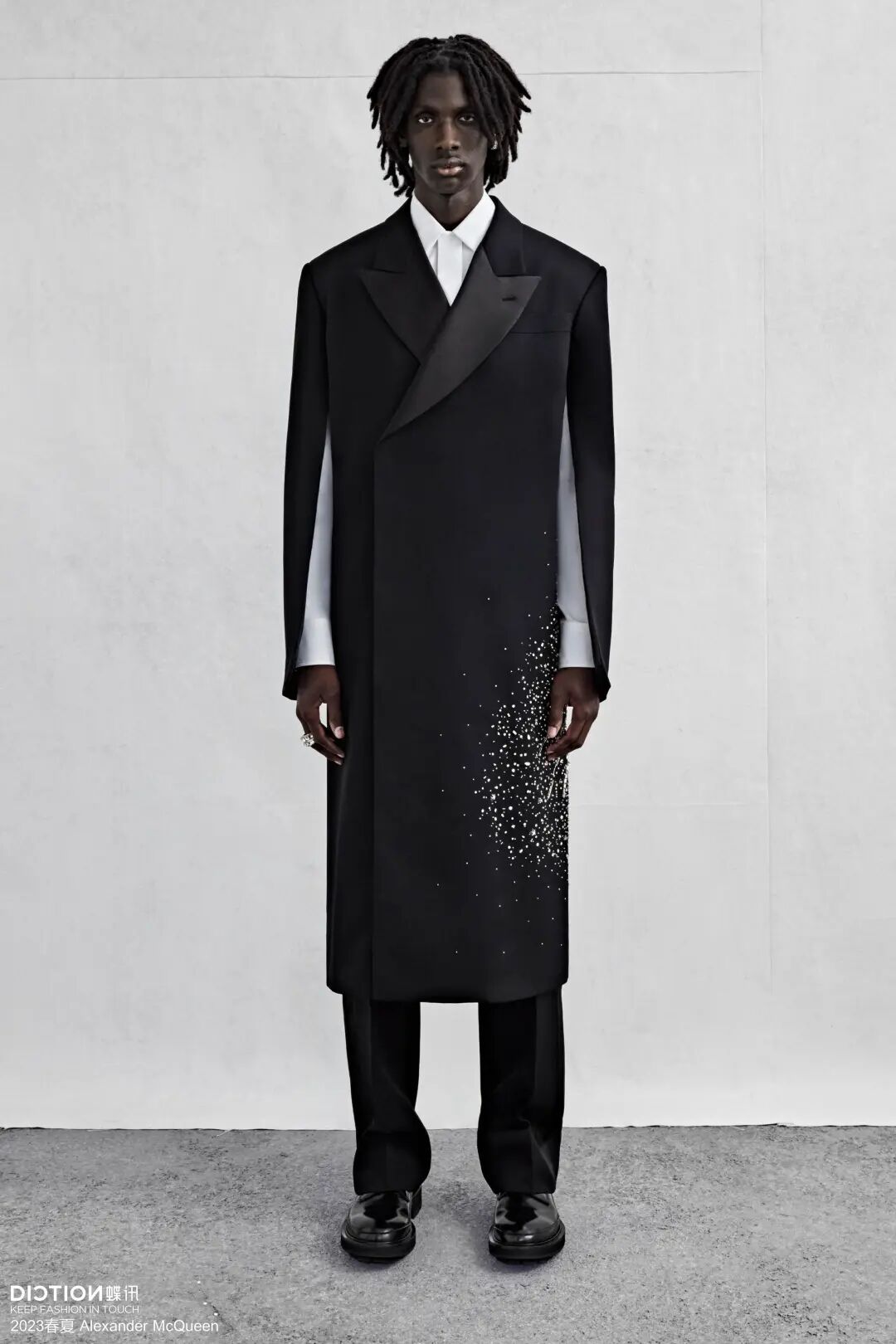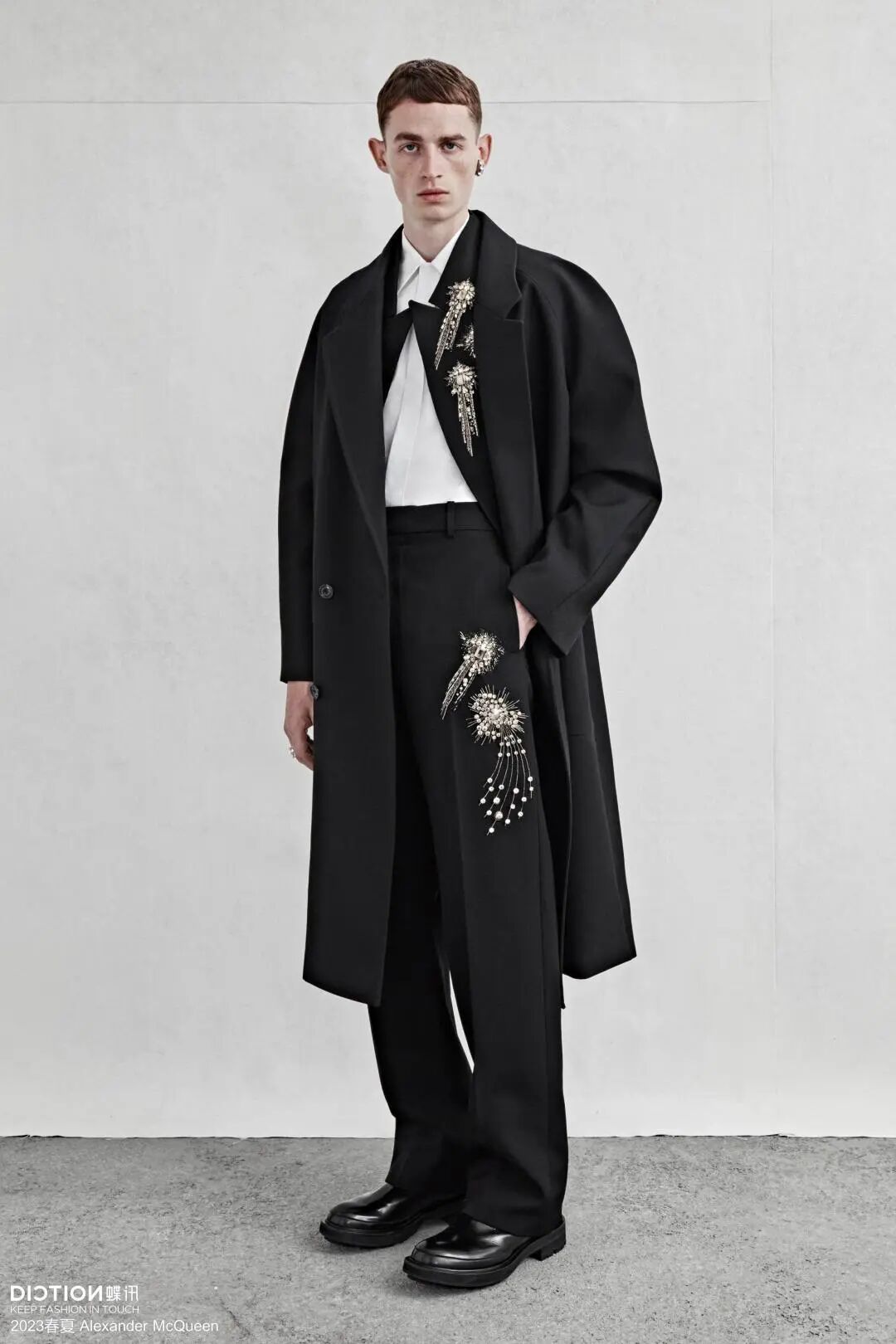 整个系列以黑白色调为主,中间穿插了泼墨、几何和字母元素,而皮革、牛仔丹宁等材料也丰富了本季的材质。整个系列运用利落干练的剪裁呈现出完美廓形,在细节上点缀金属材质与水晶装饰,让整体充满高级质感的同时又不失设计感,塑造出一个个贵气笔挺的麦昆男孩。