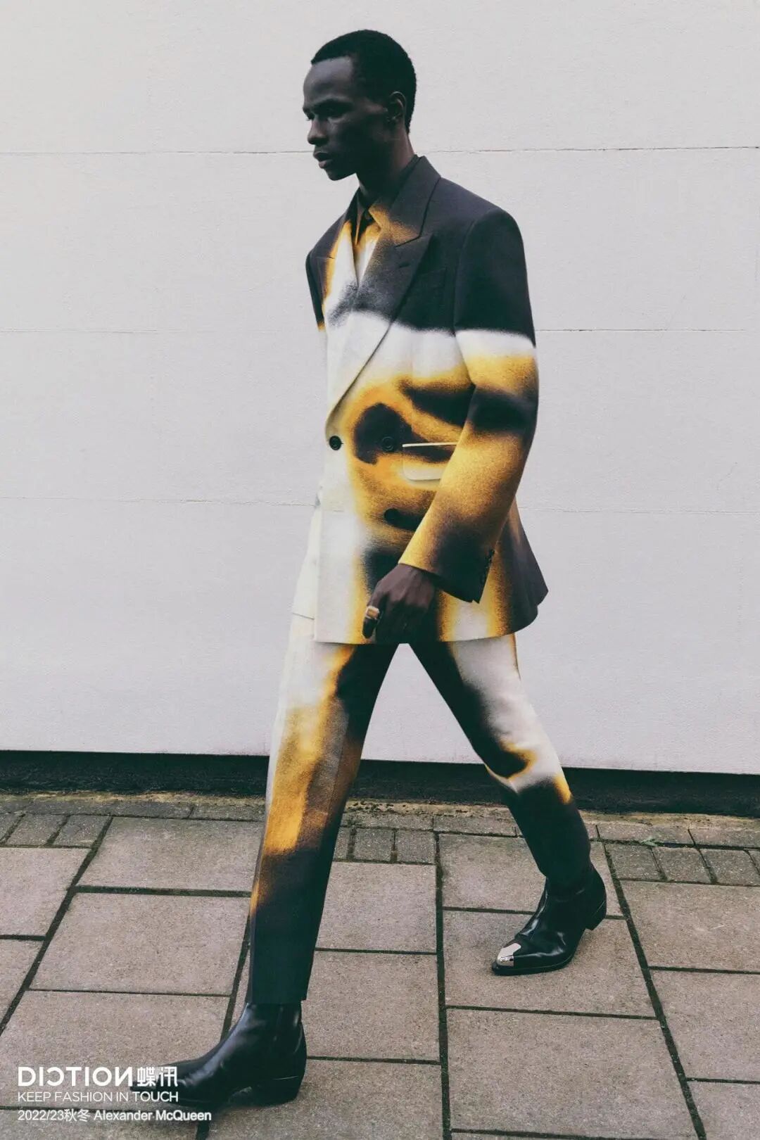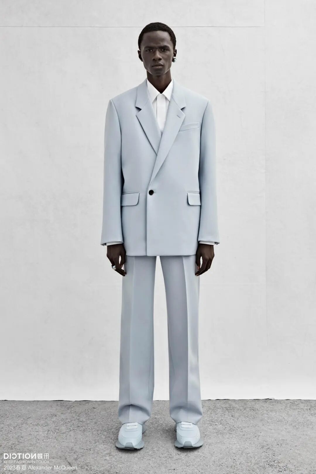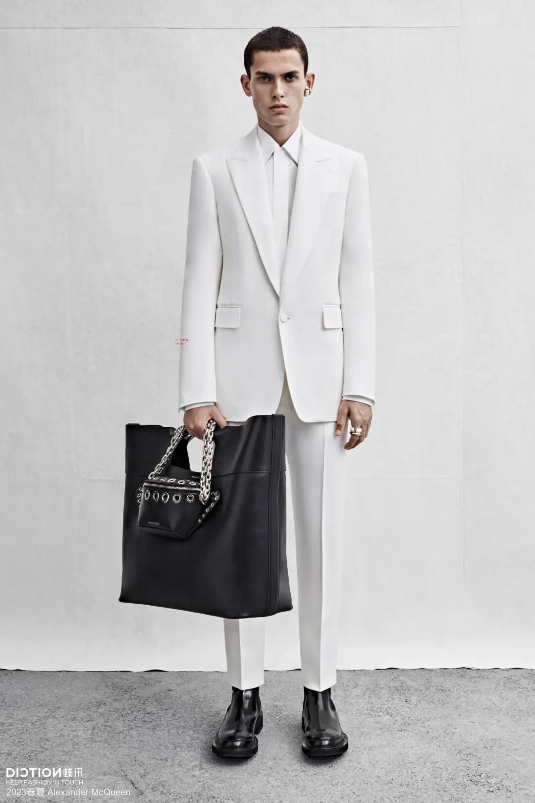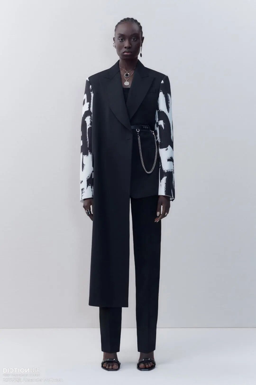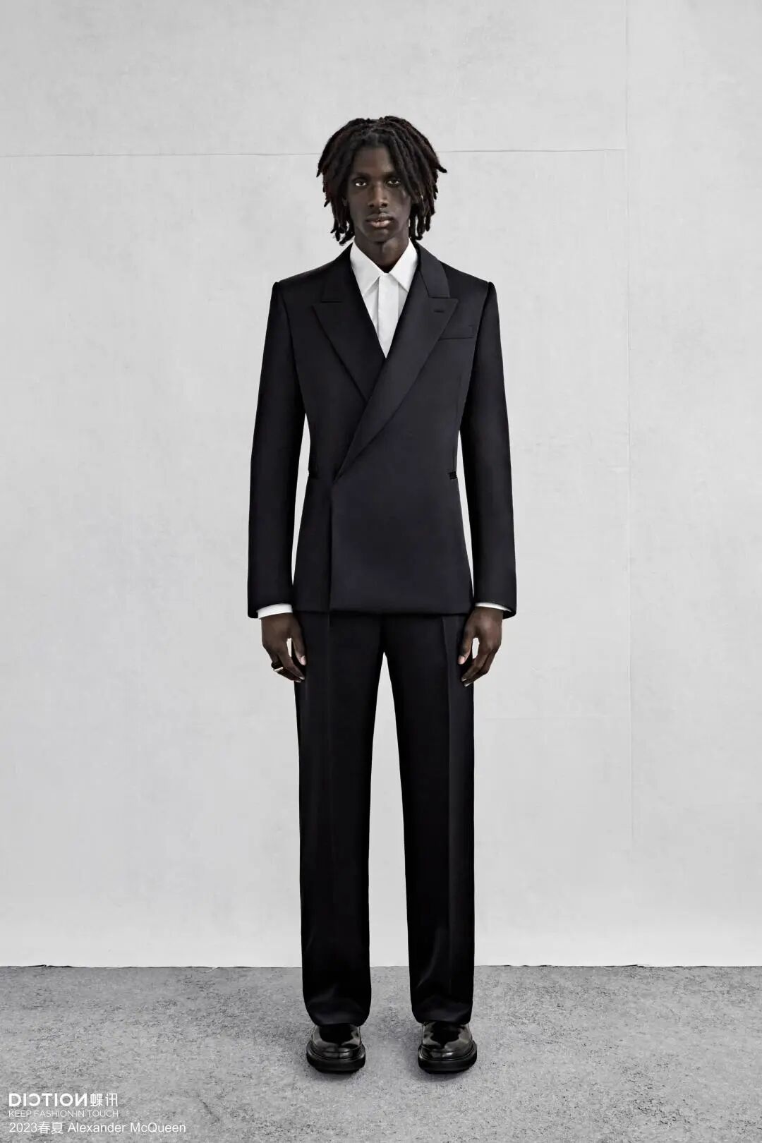 整个系列以黑白色调为主,中间穿插了泼墨、几何和字母元素,而皮革、牛仔丹宁等材料也丰富了本季的材质。整个系列运用利落干练的剪裁呈现出完美廓形,在细节上点缀金属材质与水晶装饰,让整体充满高级质感的同时又不失设计感,塑造出一个个贵气笔挺的麦昆男孩。