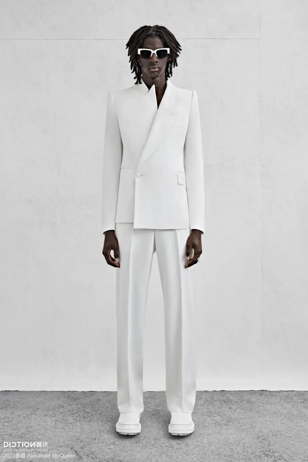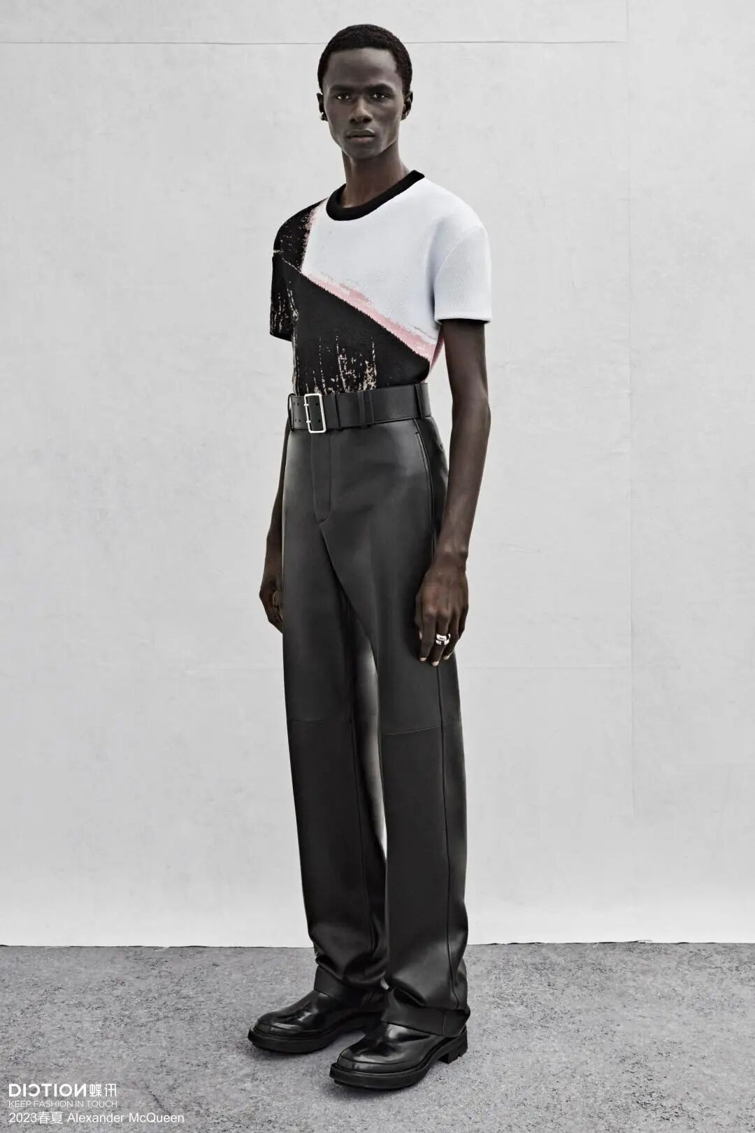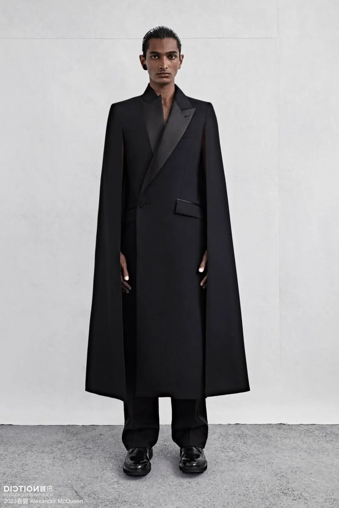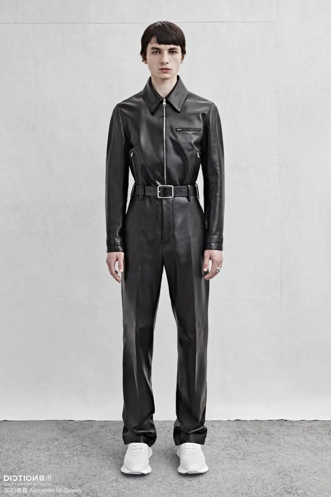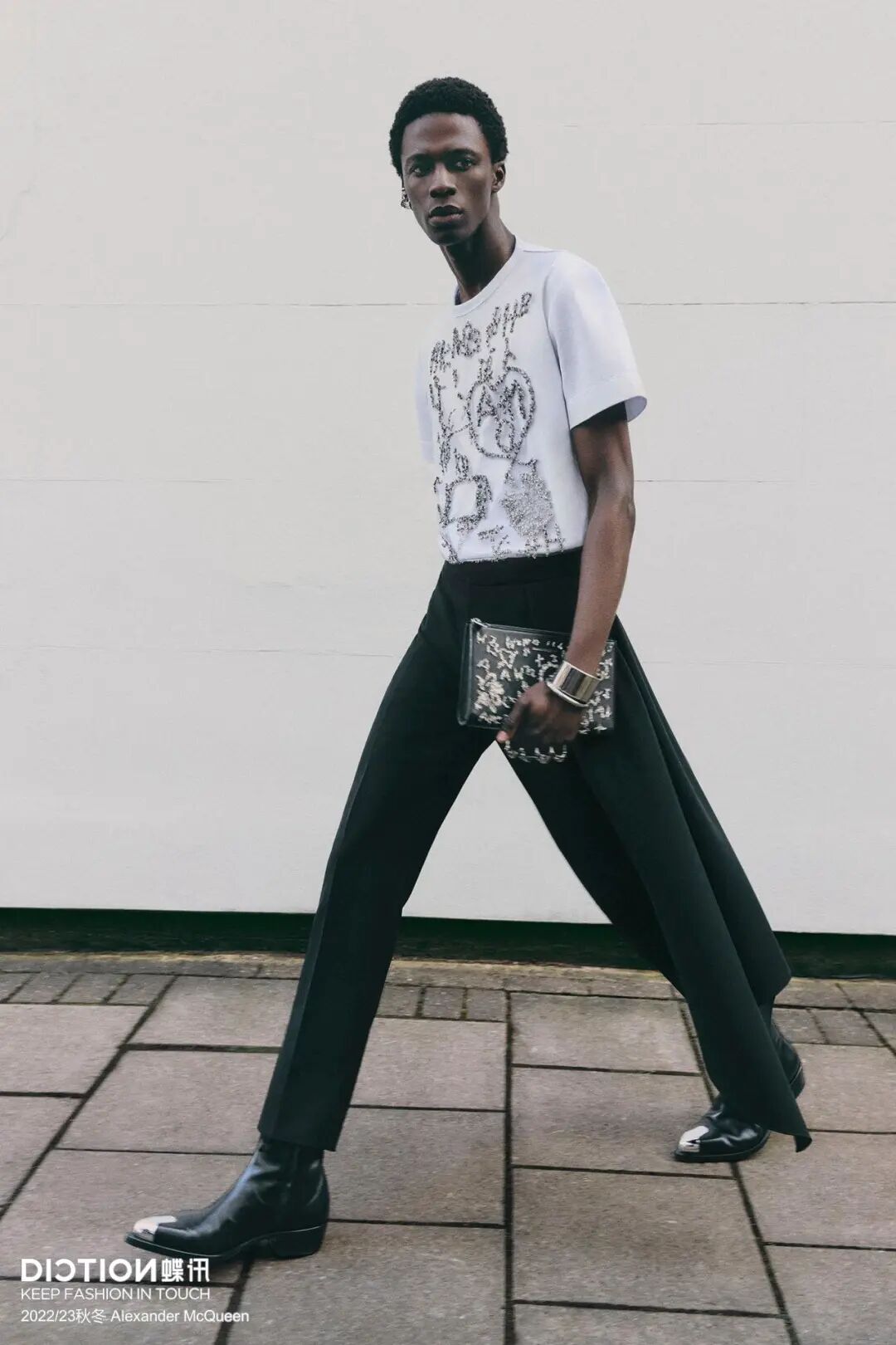 整个系列以黑白色调为主,中间穿插了泼墨、几何和字母元素,而皮革、牛仔丹宁等材料也丰富了本季的材质。整个系列运用利落干练的剪裁呈现出完美廓形,在细节上点缀金属材质与水晶装饰,让整体充满高级质感的同时又不失设计感,塑造出一个个贵气笔挺的麦昆男孩。