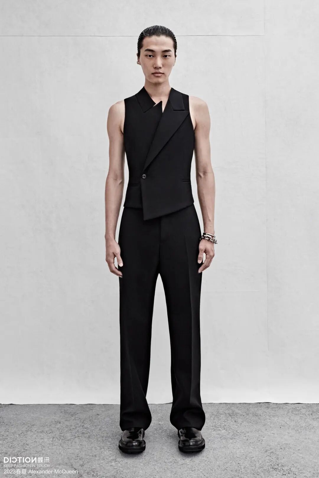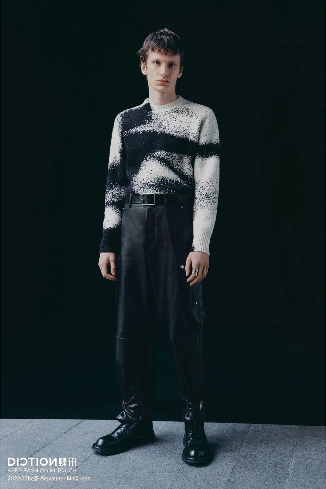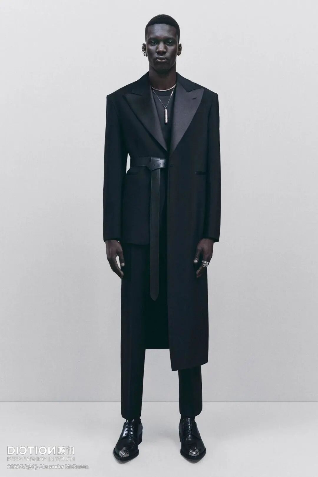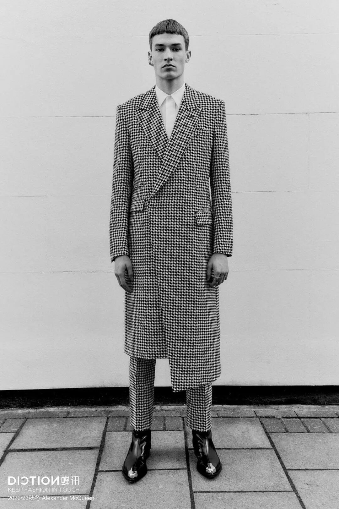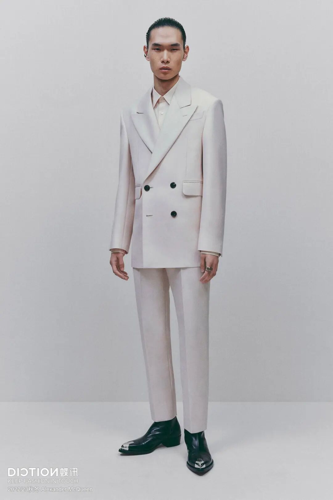 整个系列以黑白色调为主,中间穿插了泼墨、几何和字母元素,而皮革、牛仔丹宁等材料也丰富了本季的材质。整个系列运用利落干练的剪裁呈现出完美廓形,在细节上点缀金属材质与水晶装饰,让整体充满高级质感的同时又不失设计感,塑造出一个个贵气笔挺的麦昆男孩。