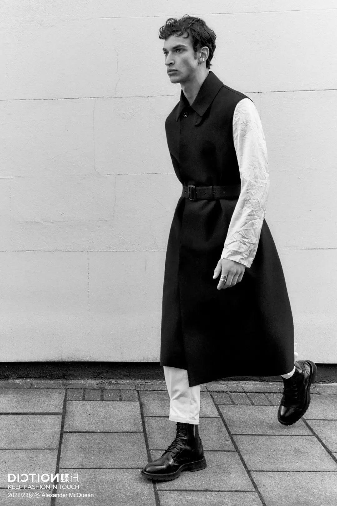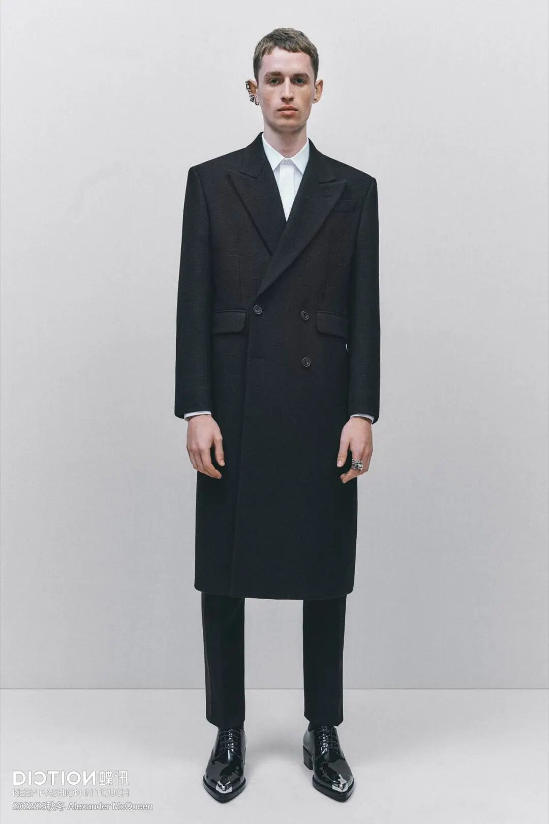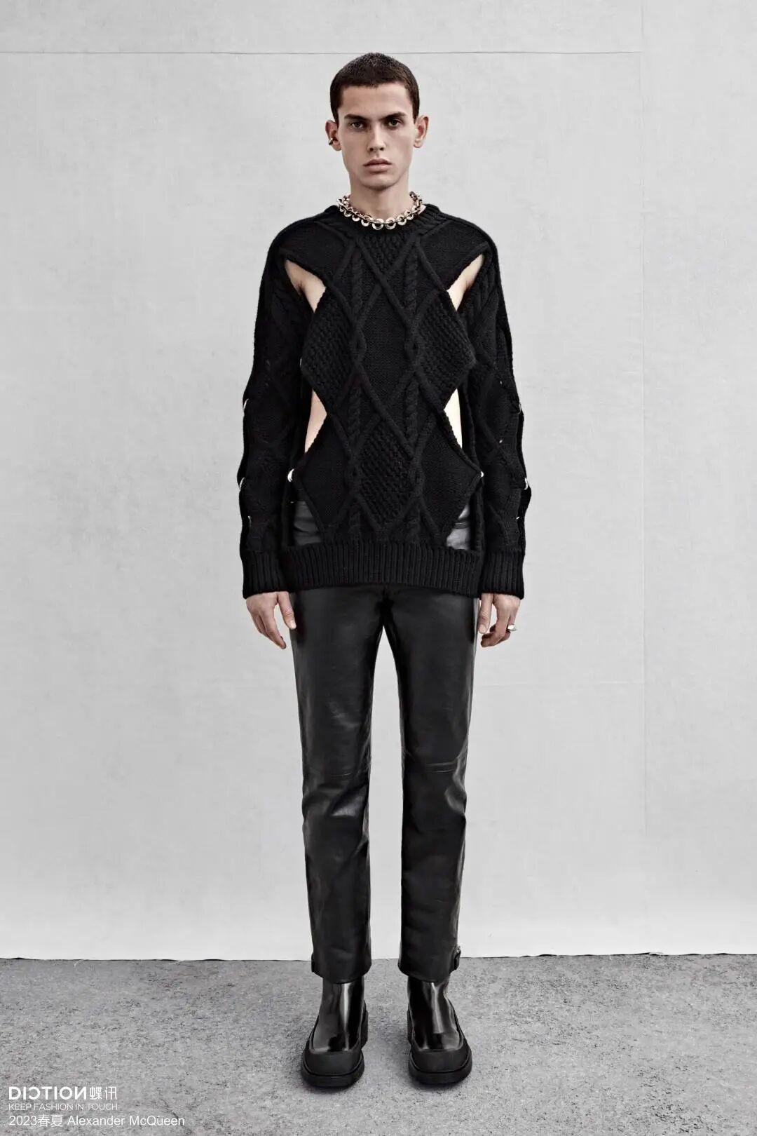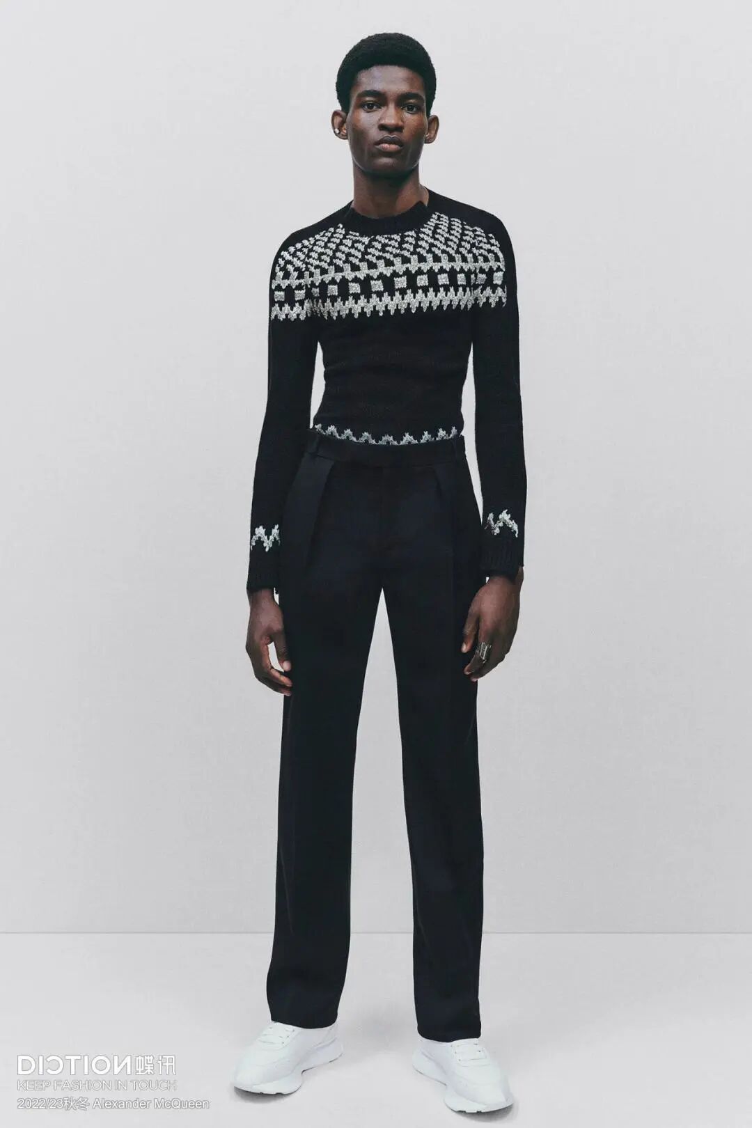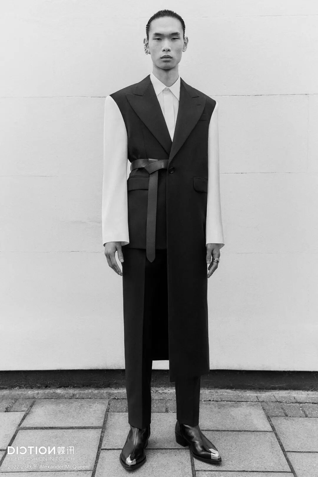 整个系列以黑白色调为主,中间穿插了泼墨、几何和字母元素,而皮革、牛仔丹宁等材料也丰富了本季的材质。整个系列运用利落干练的剪裁呈现出完美廓形,在细节上点缀金属材质与水晶装饰,让整体充满高级质感的同时又不失设计感,塑造出一个个贵气笔挺的麦昆男孩。