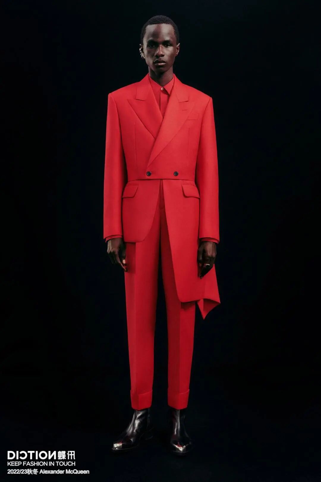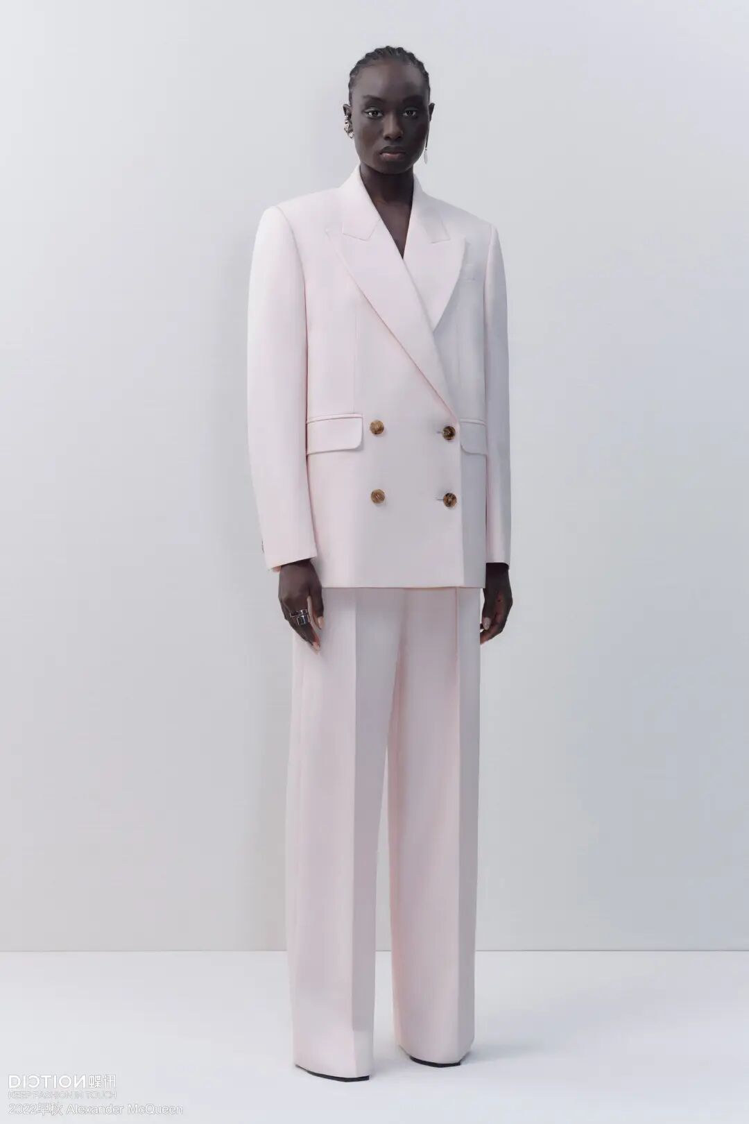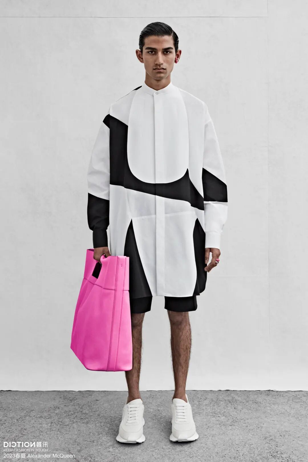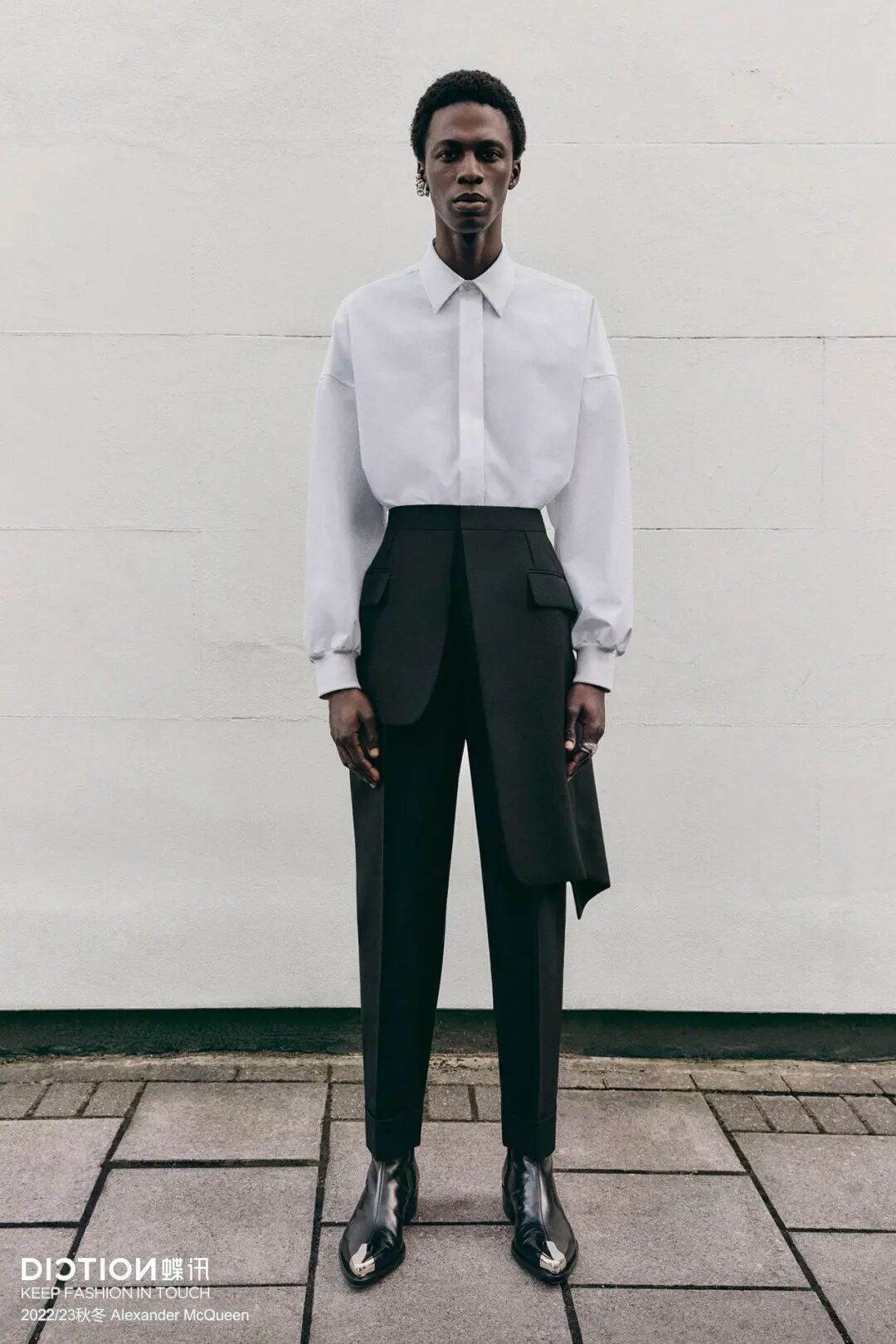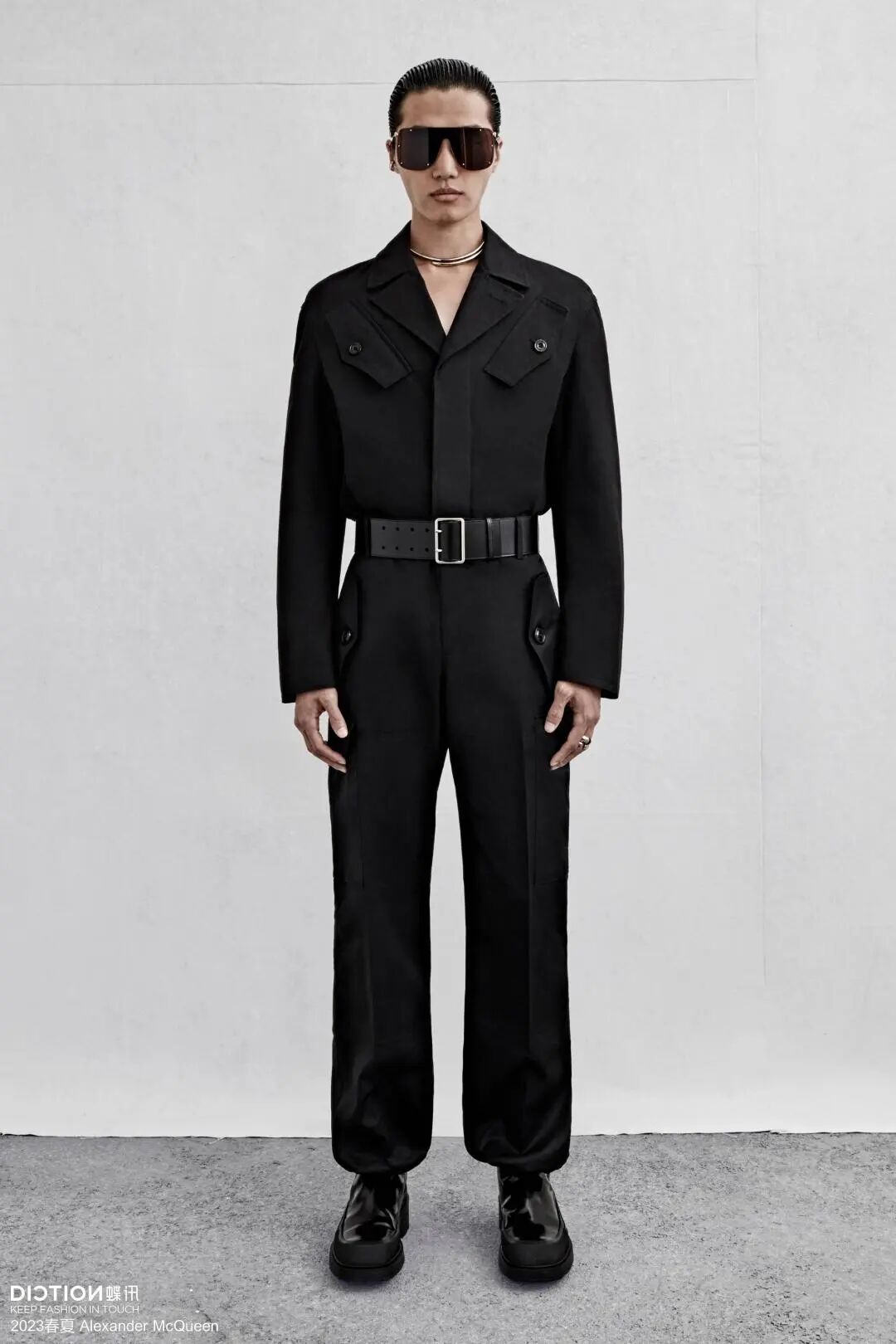 整个系列以黑白色调为主,中间穿插了泼墨、几何和字母元素,而皮革、牛仔丹宁等材料也丰富了本季的材质。整个系列运用利落干练的剪裁呈现出完美廓形,在细节上点缀金属材质与水晶装饰,让整体充满高级质感的同时又不失设计感,塑造出一个个贵气笔挺的麦昆男孩。