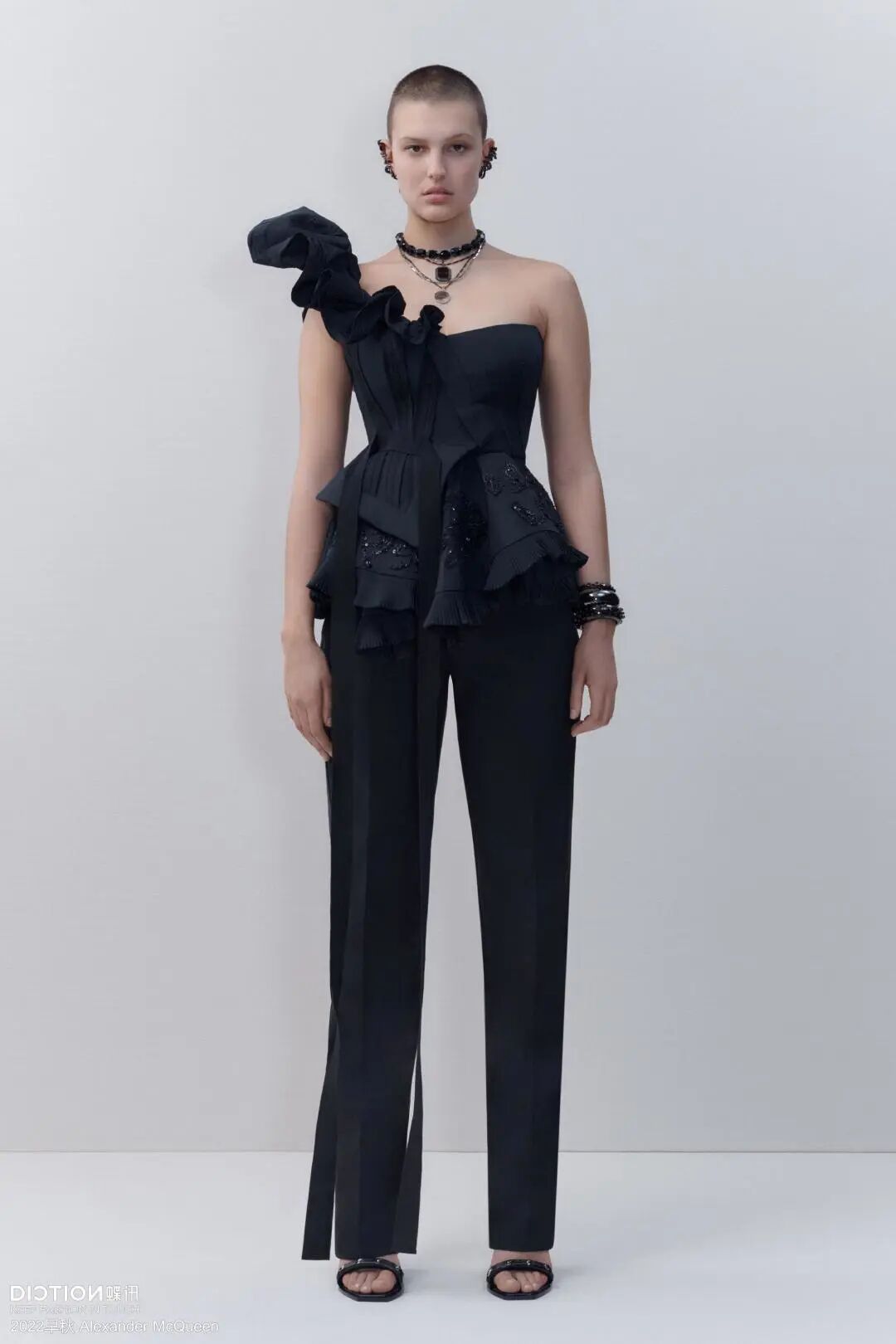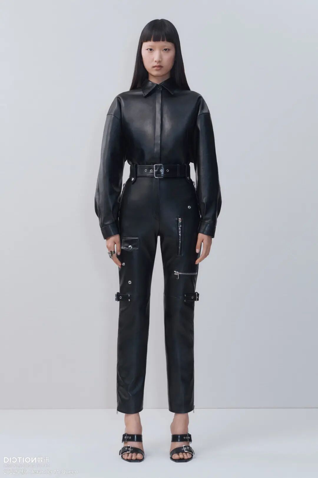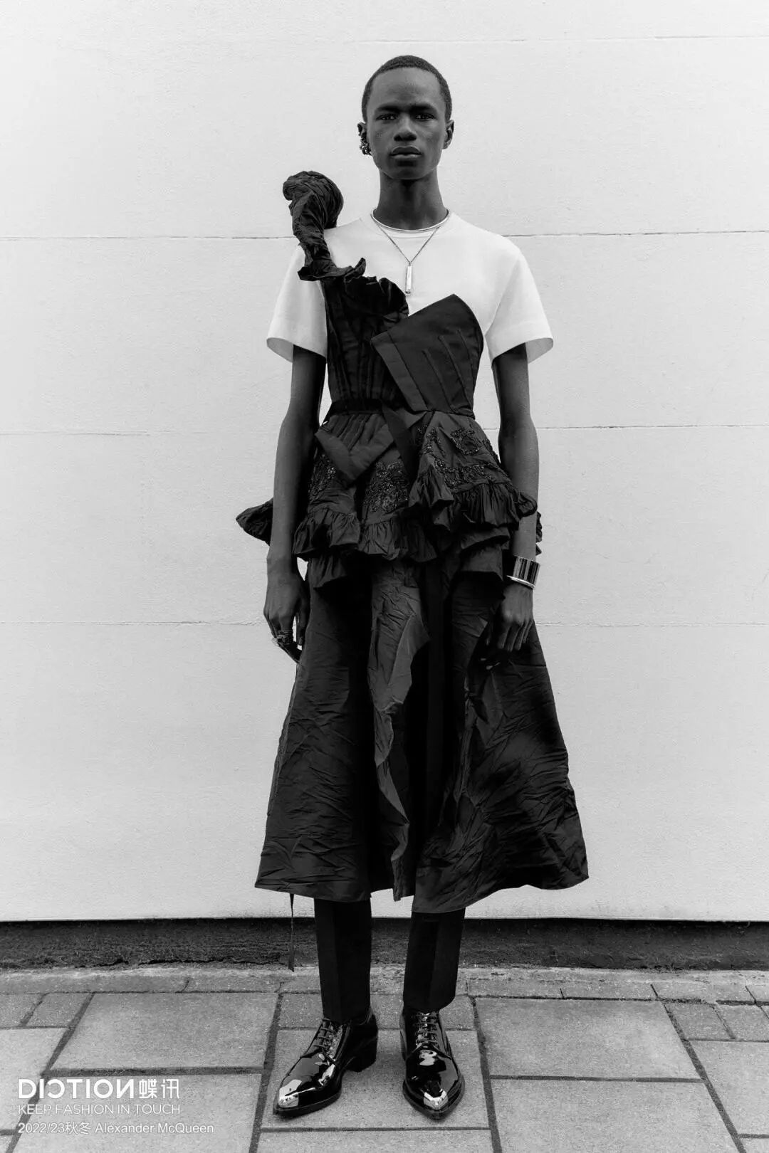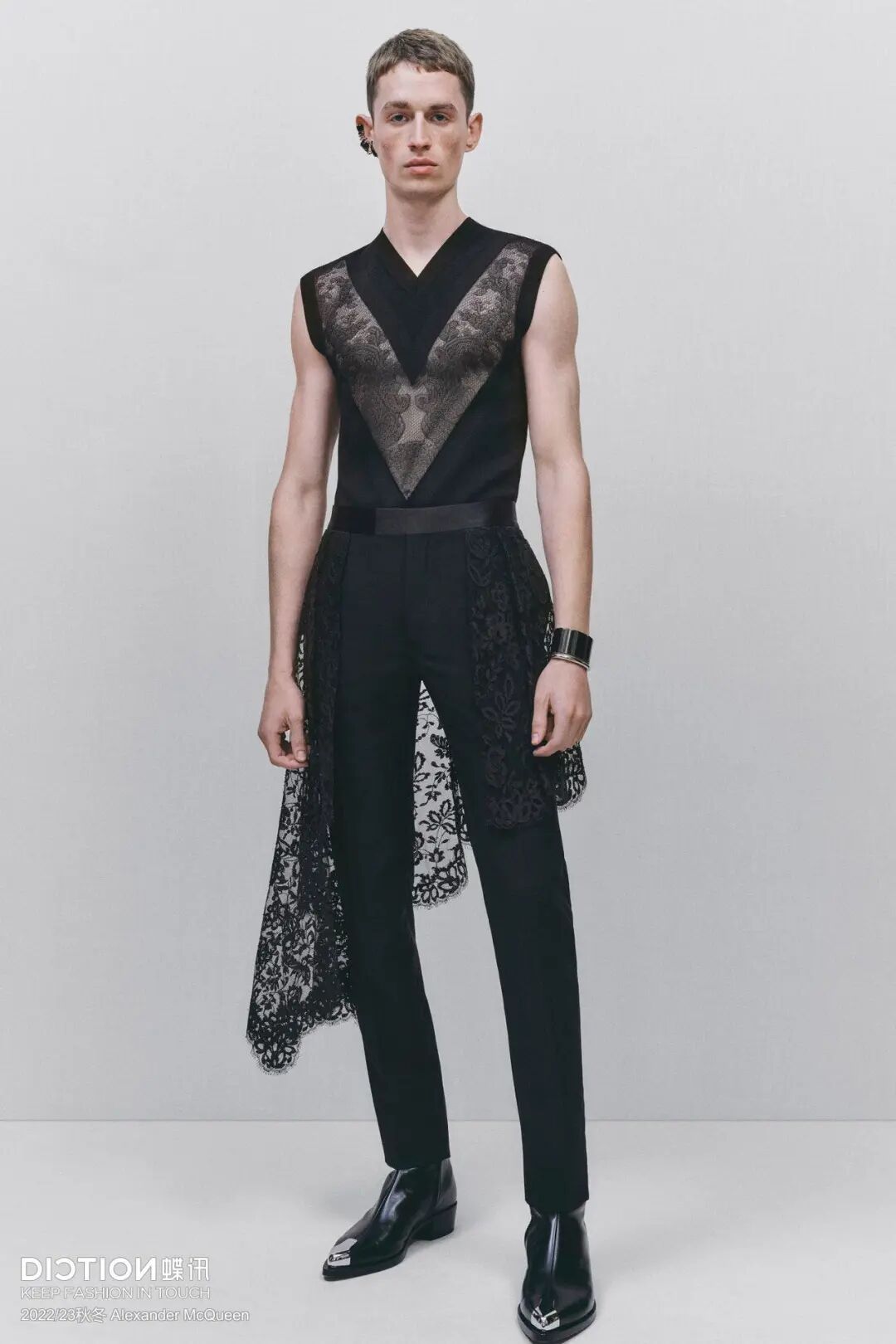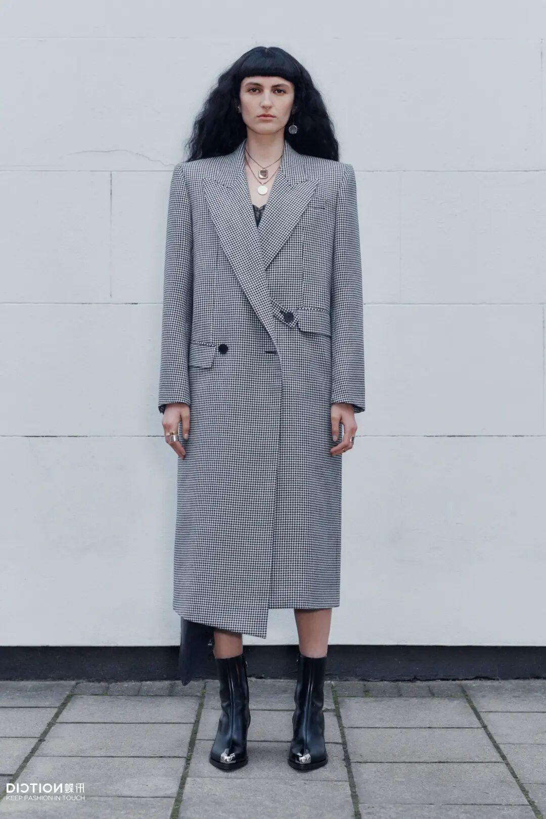 整个系列以黑白色调为主,中间穿插了泼墨、几何和字母元素,而皮革、牛仔丹宁等材料也丰富了本季的材质。整个系列运用利落干练的剪裁呈现出完美廓形,在细节上点缀金属材质与水晶装饰,让整体充满高级质感的同时又不失设计感,塑造出一个个贵气笔挺的麦昆男孩。