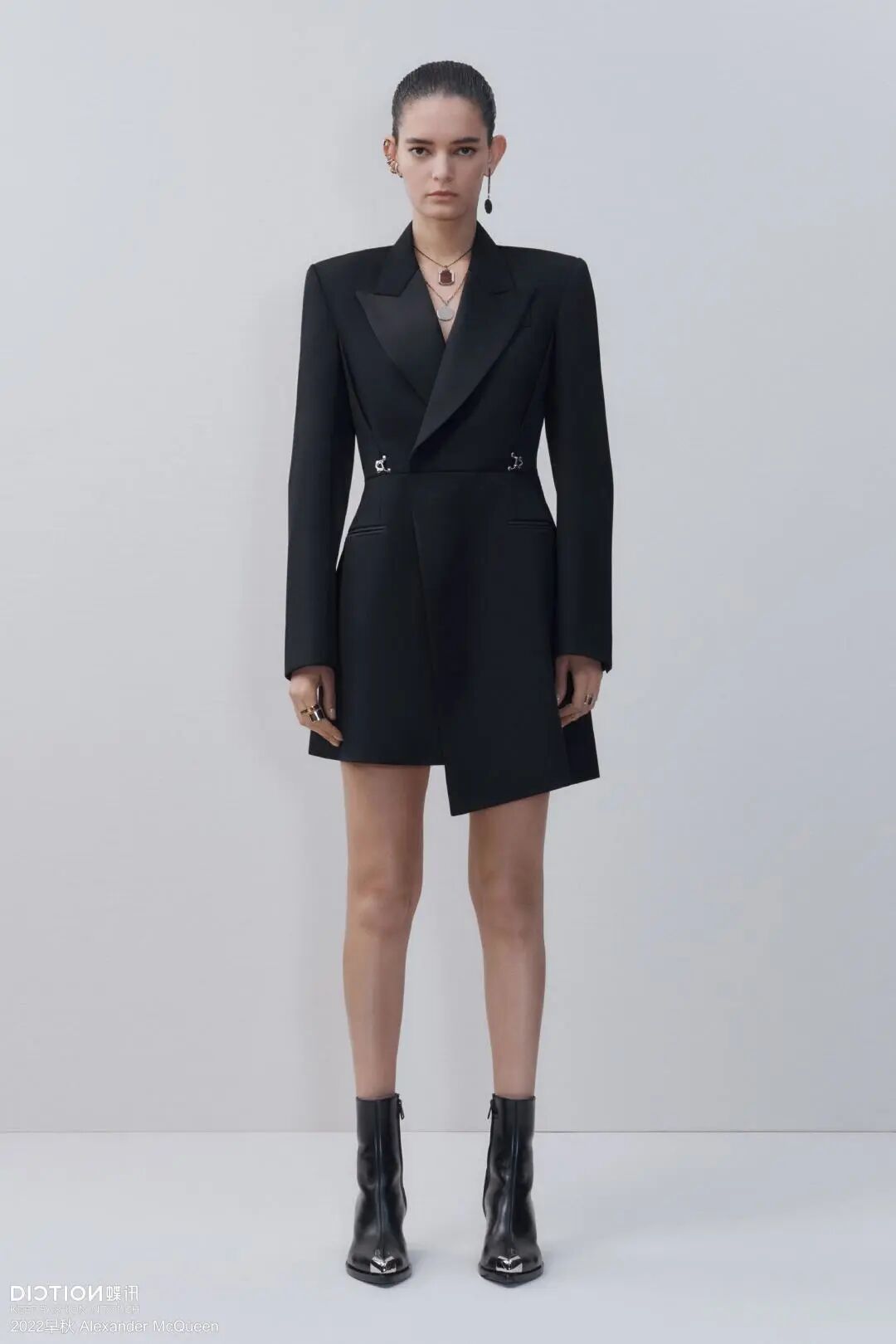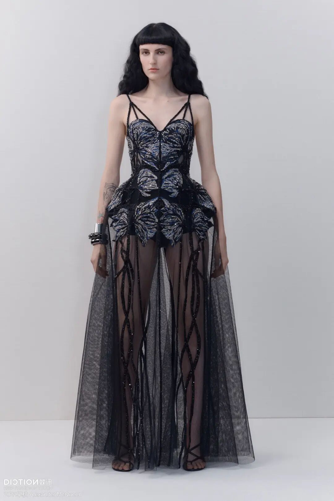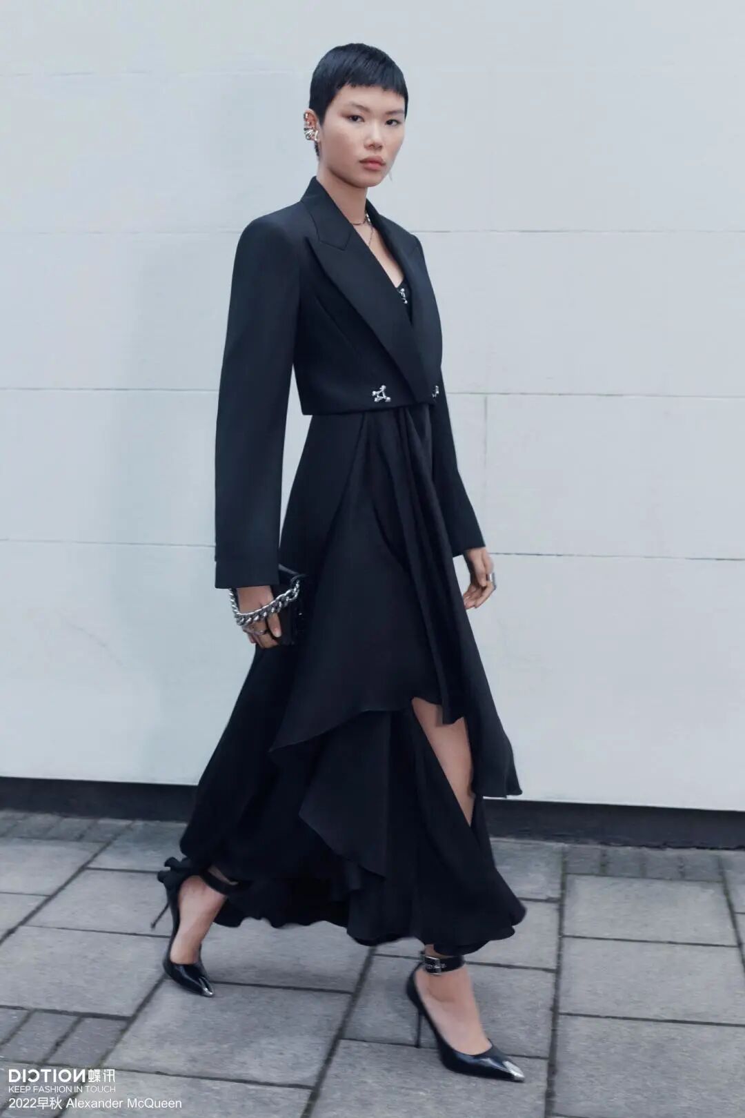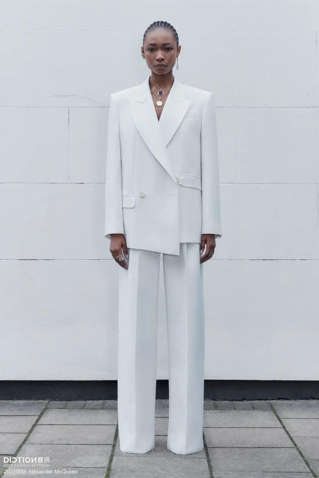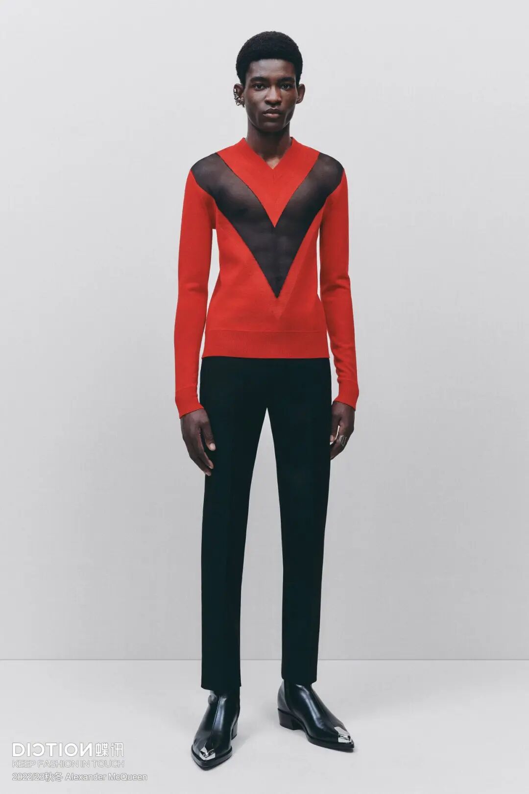 整个系列以黑白色调为主,中间穿插了泼墨、几何和字母元素,而皮革、牛仔丹宁等材料也丰富了本季的材质。整个系列运用利落干练的剪裁呈现出完美廓形,在细节上点缀金属材质与水晶装饰,让整体充满高级质感的同时又不失设计感,塑造出一个个贵气笔挺的麦昆男孩。