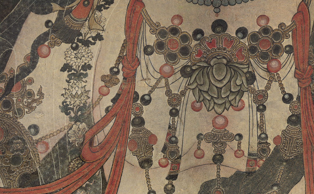 “水月观音”中所有的轮廓线均采用“沥粉堆金”的画法勾勒,每一条轮廓线都独具浮雕般的立体效果,整个画面璎珞缤纷、光华灿烂。