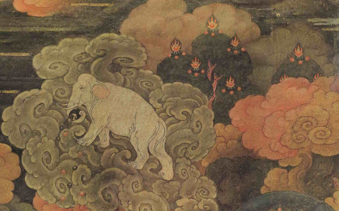 普贤座下六牙白象,只用淡墨一勾,从笔势的顿挫转折中,巧妙地表现了象体的蜷伏着的沉重厚硕的质感。