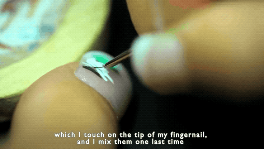 指甲是微绘大师的调色板,他们双眼并不离开显微镜,以细毛画笔沾取不同颜料,在自己的拇指或食指指甲上缓慢调和,调出猛虎虹膜、雄狮毛发、火烈鸟羽毛等天然色彩。