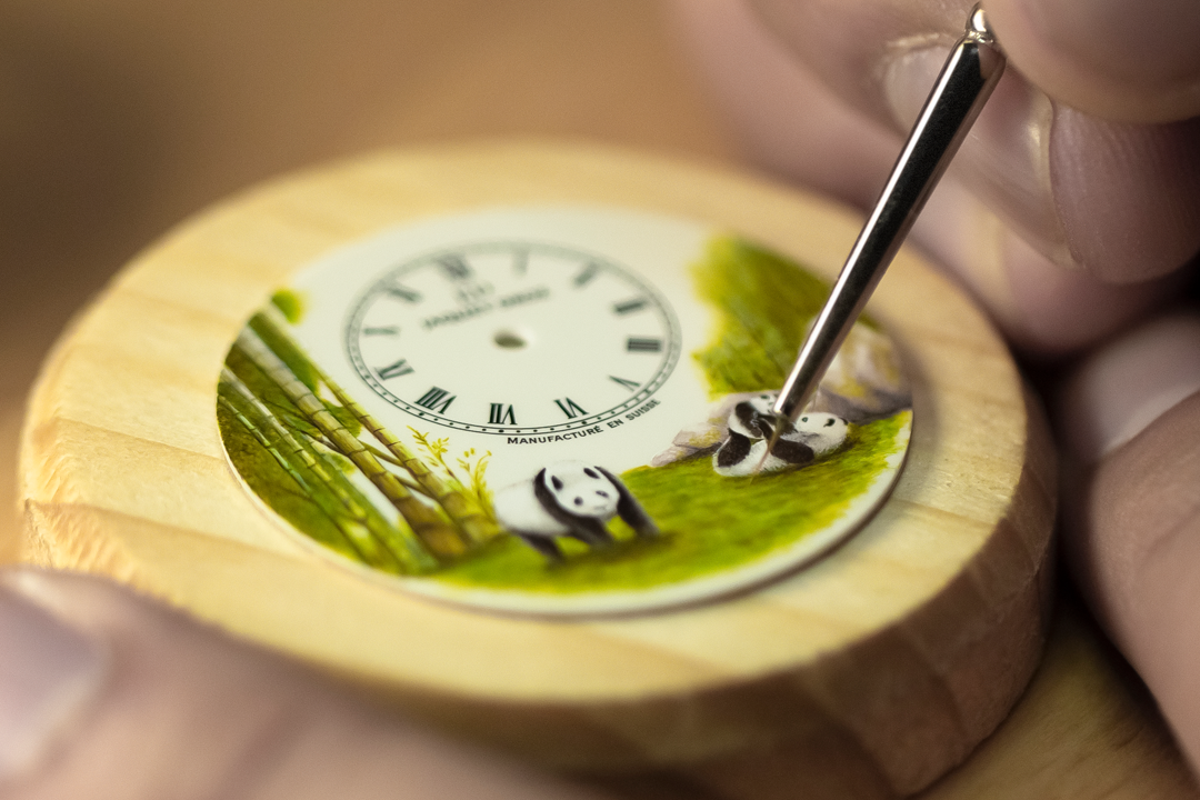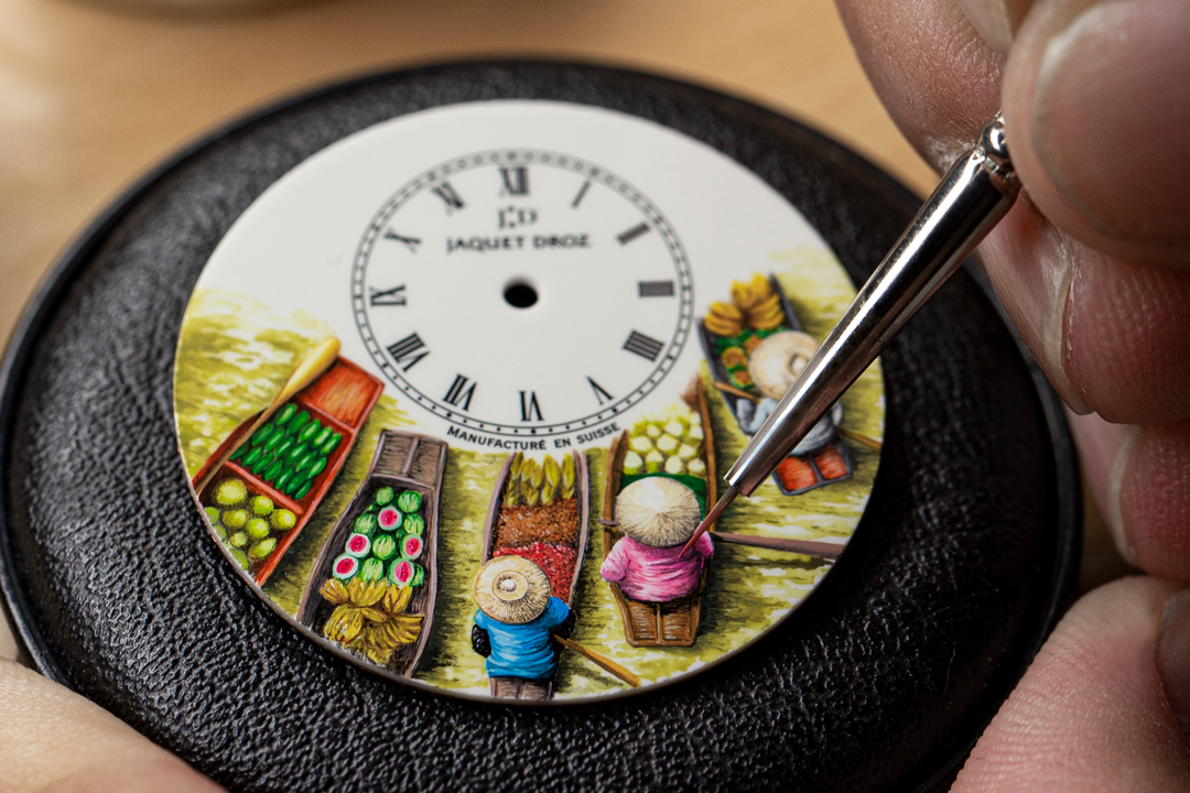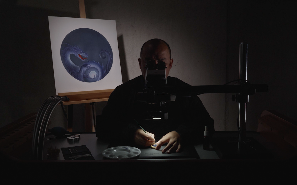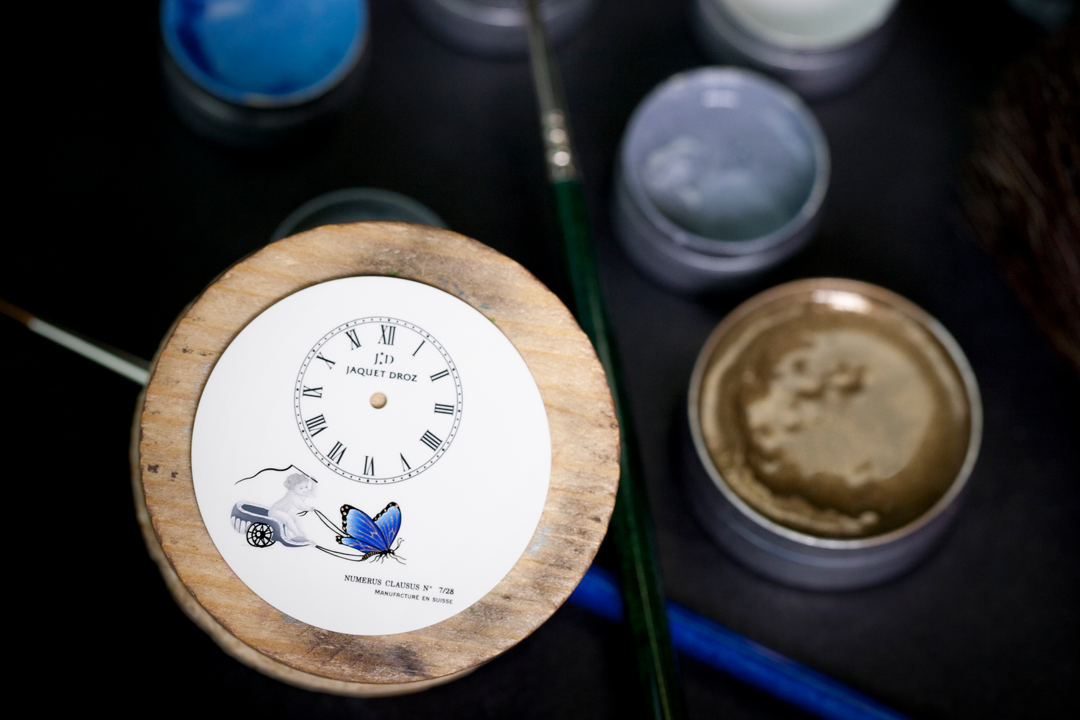 在一部雅克德罗艺术工坊的纪录短片里,我们看到微绘大师以极度的热爱与耐性,在显微镜前端坐如雕塑,只有他们的手在轻轻颤动,画笔在表盘上如蜻蜓点水,一丝一毫地勾画描绘。