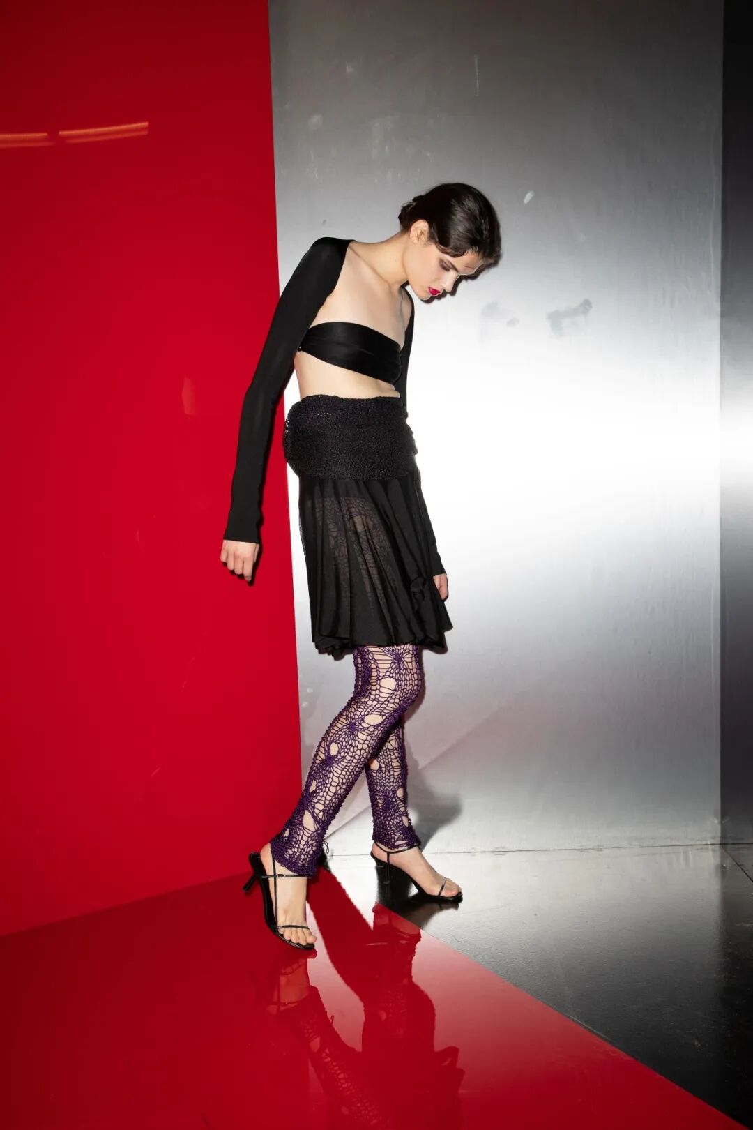 本系列是一场Averett对自身极多主义的回归。如蛛网般的罩衫与打底裤成为本季的亮点,打造出繁复层叠的连衣裙,配以彩色的内搭以巧妙的形式裸露着肌肤。