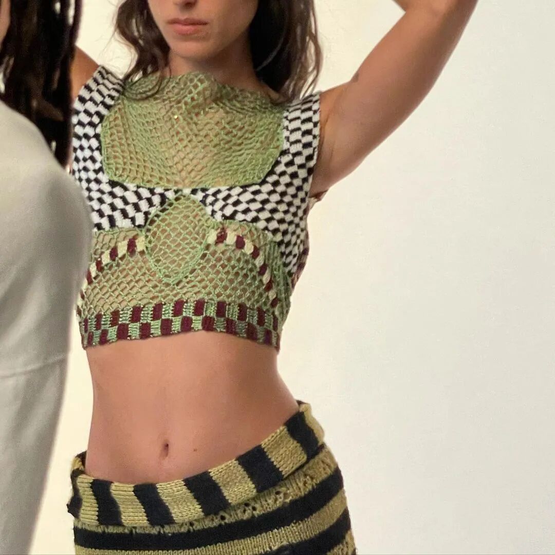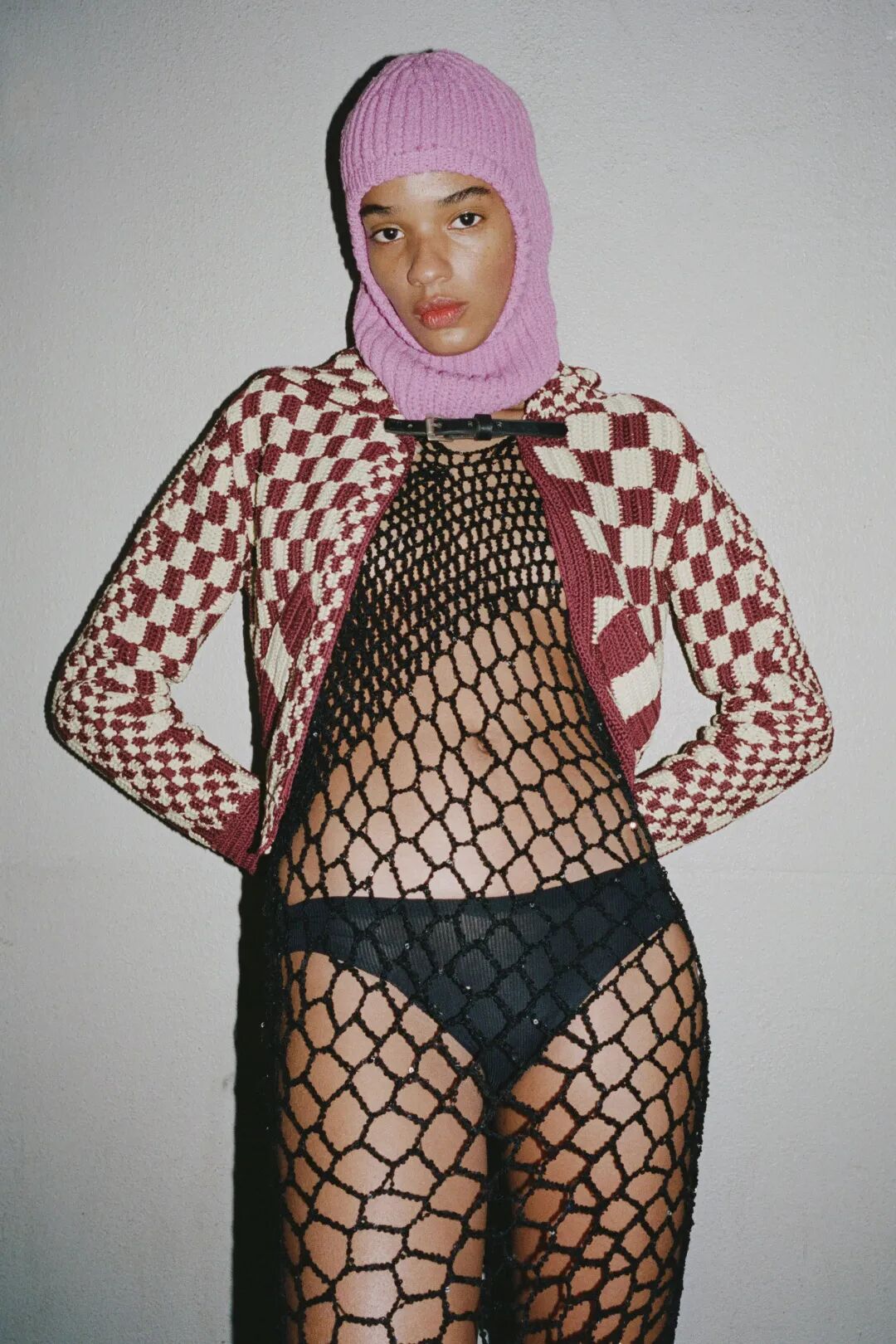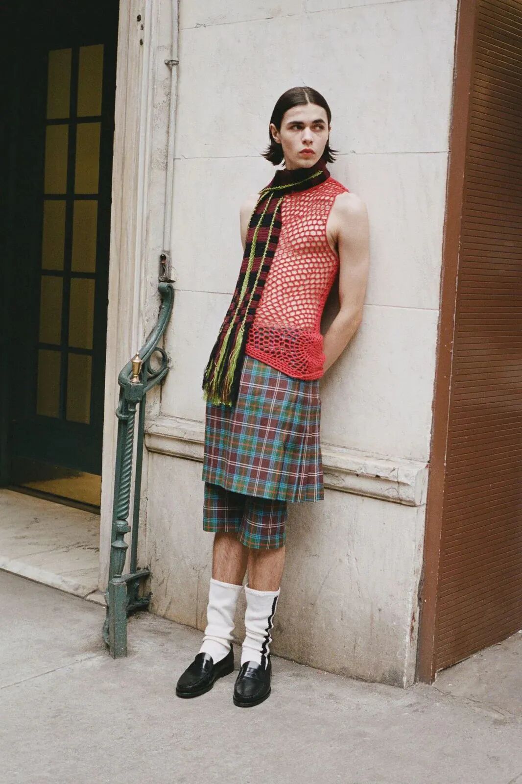 2022秋冬的设计比他过去的作品更荒诞出格。针织品中常见的棋盘格针织厚开衫,通过Averett有趣的扭曲手法配以明动的色彩,转化为鲜明的“Averett Style”。
