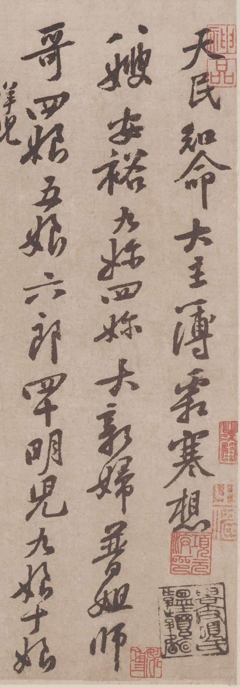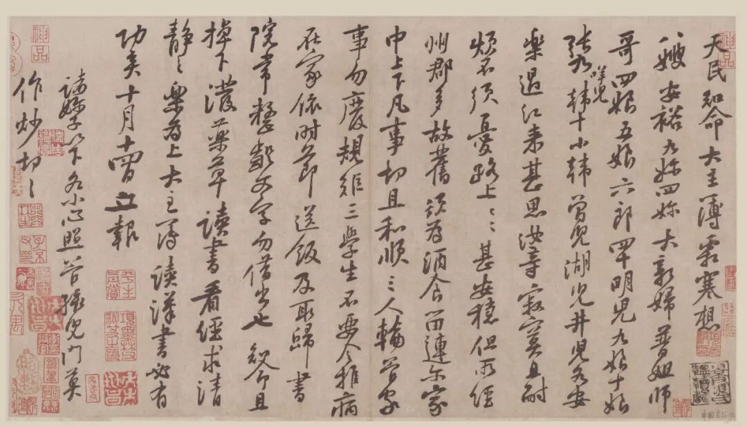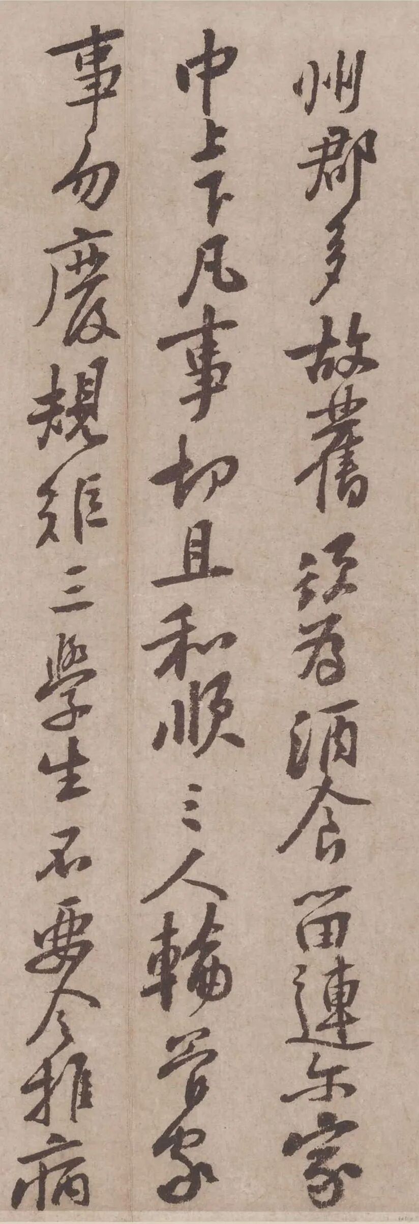 天民、知命、大主簿:霜寒,想八嫂安裕、九妳、四妳、大新婦、普姐、師哥、四娘、五娘、六郎、四十、明兒、九娘、十娘、張九(咩兒)、韓十、小韓、曾兒、湖兒、井兒,各安樂。過江來,甚思汝等,寂寞且耐煩,不須憂路上,路上甚安穩。但所經州郡多故舊,須爲酒食留連爾。家中上下,凡事切且和順。三人輪管家事,勿廢規矩。三學生不要令推病在家,依時節送飯及取歸。書院常整齪、文字勿借出也。知命且掉下潑藥草,讀書看經,求清靜之樂爲上,大主簿讀《漢書》必有功矣。十月十四日,立報。諸嬭子以下,各小心照管孩兒們,莫作炒,切切。