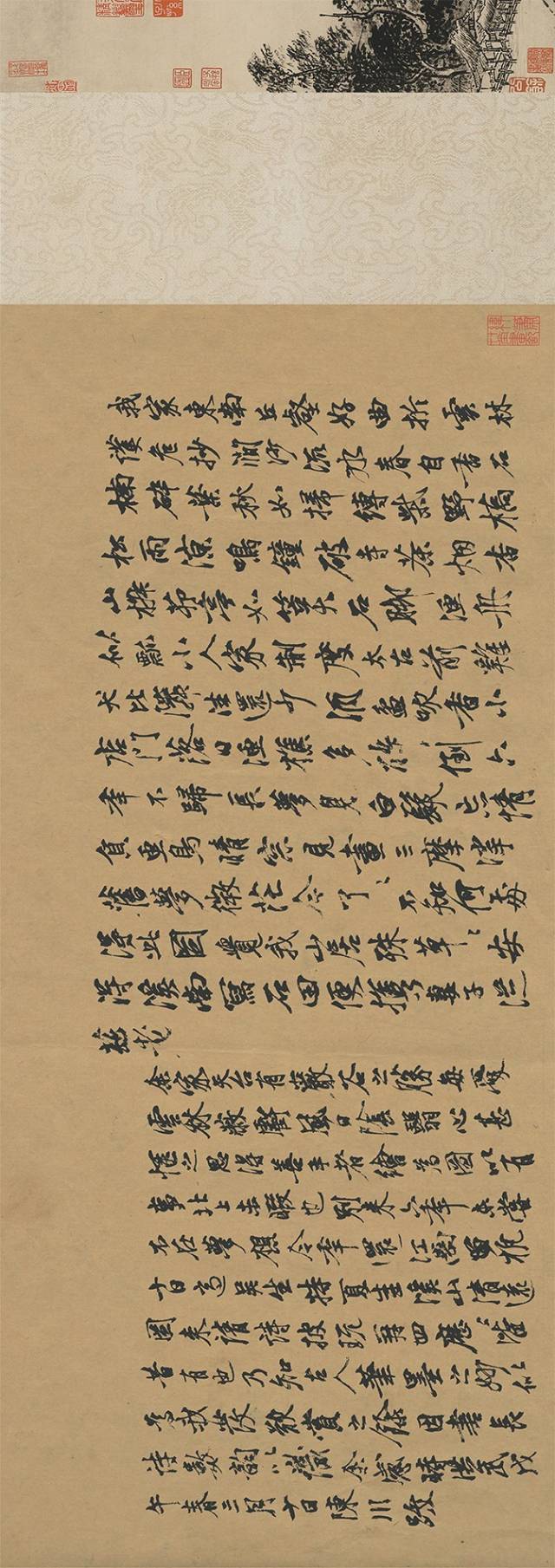 此幅卷首古松巨石,烟雾丘陵;平移而下,可见丛林掩映山庄,有农夫、僧人徐行;江水辽阔,远山空蒙,风帆点点;对岸突起悬崖危岩,树木森森。山外有木桥接岸,桥上有闲人谈话,桥下货船忙于装卸;桥边是村树篱舍,与近景相对处为水天苍茫,令人心旷神怡。漫步出村,又见烟波浩渺,茂林叠翠,奇峰突兀;山下巨石大树,浅溪木桥,平滩斜坡,过坡至山村茅蓬处则画卷终了。此画卷逶迤百里,使观者游目骋思而留连忘返。