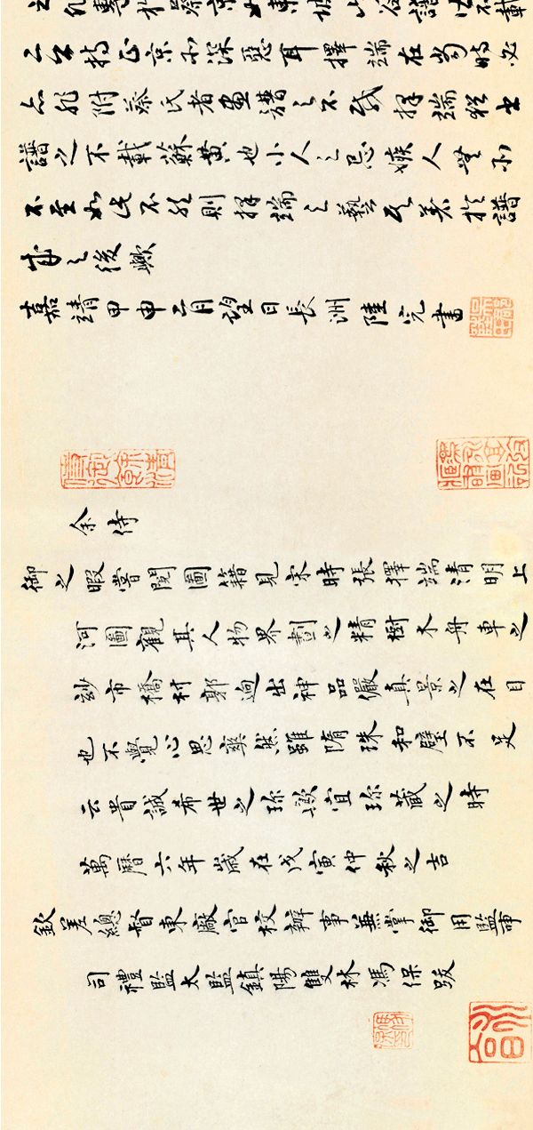 第一段的题跋者是金人张著,在题跋中述说了作画者张择端的具体情况,是了解《清明上河图》作者的第一份材料。