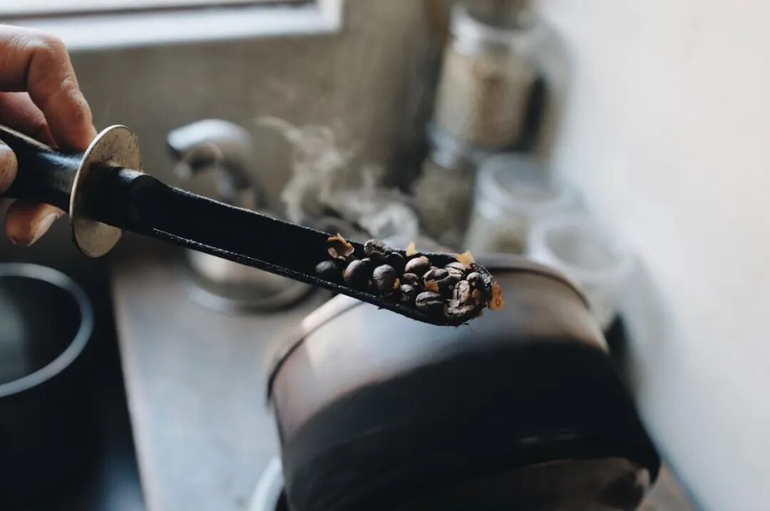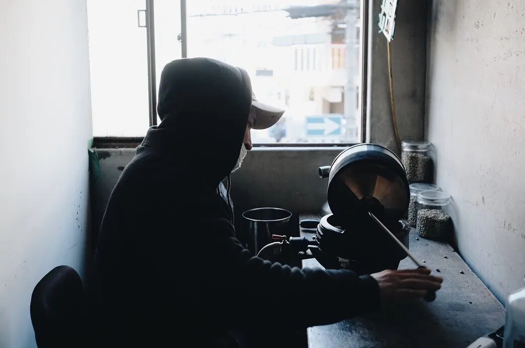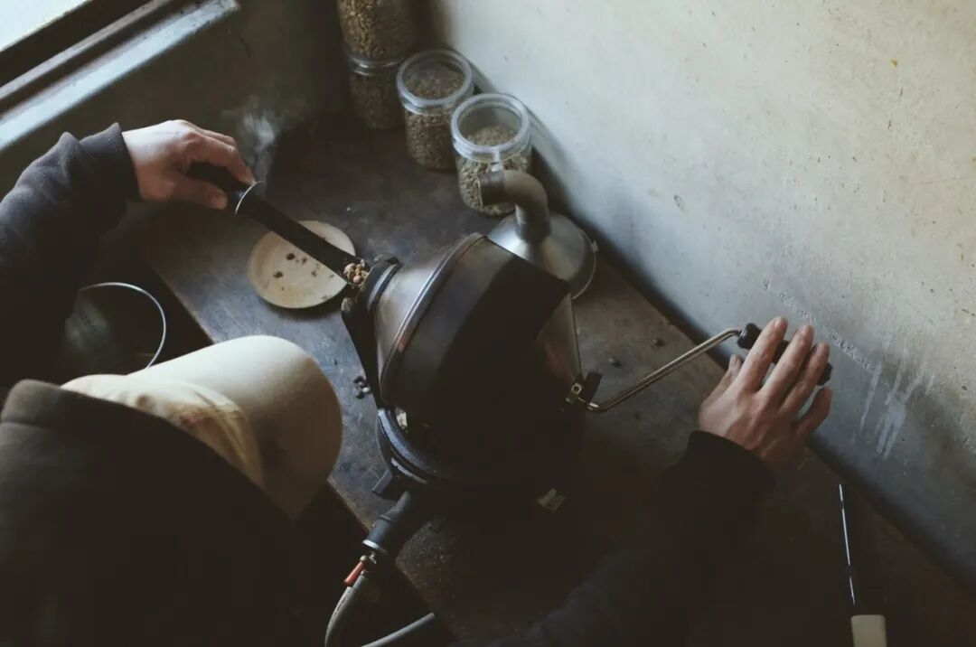除了这个小小的咖啡摊,在中央批发市场丁字路口的二楼有一个比榻榻米还小的房间,这是“微光”咖啡的烘焙房。在昏暗的烤房里,有一个燃气灶和小型不锈钢手摇烤炉。Jackie Chan通常在这里根据从豆子中流出的水声、豆子薄皮剥落的声音以及一些小细节传递到手的感觉来纯手工烘焙豆子。
