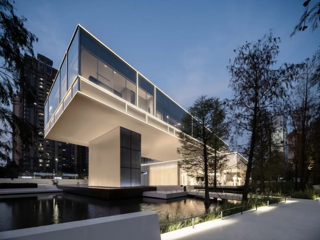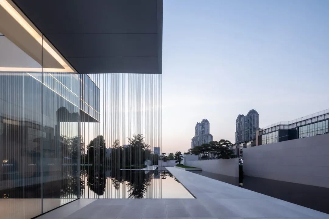 建筑立面采用了大面积的无肋玻璃幕墙,削弱了建筑的体量感,弱化室内外的阻隔,增加建筑的透明性与艺术性,使得建筑与自然的边界消弥。建筑入口处摈弃了厚重结构柱,采用细密的金属拉杆,融于水面,形成的倒影,营造出虚实难辨的梦幻效果。