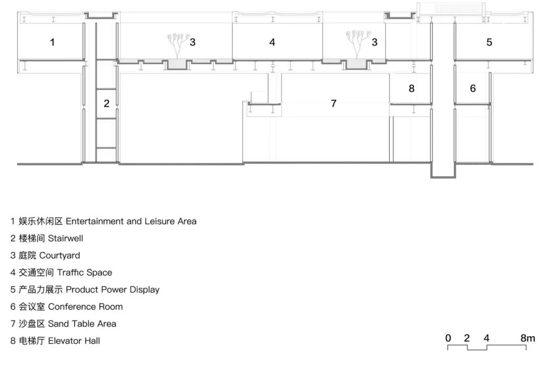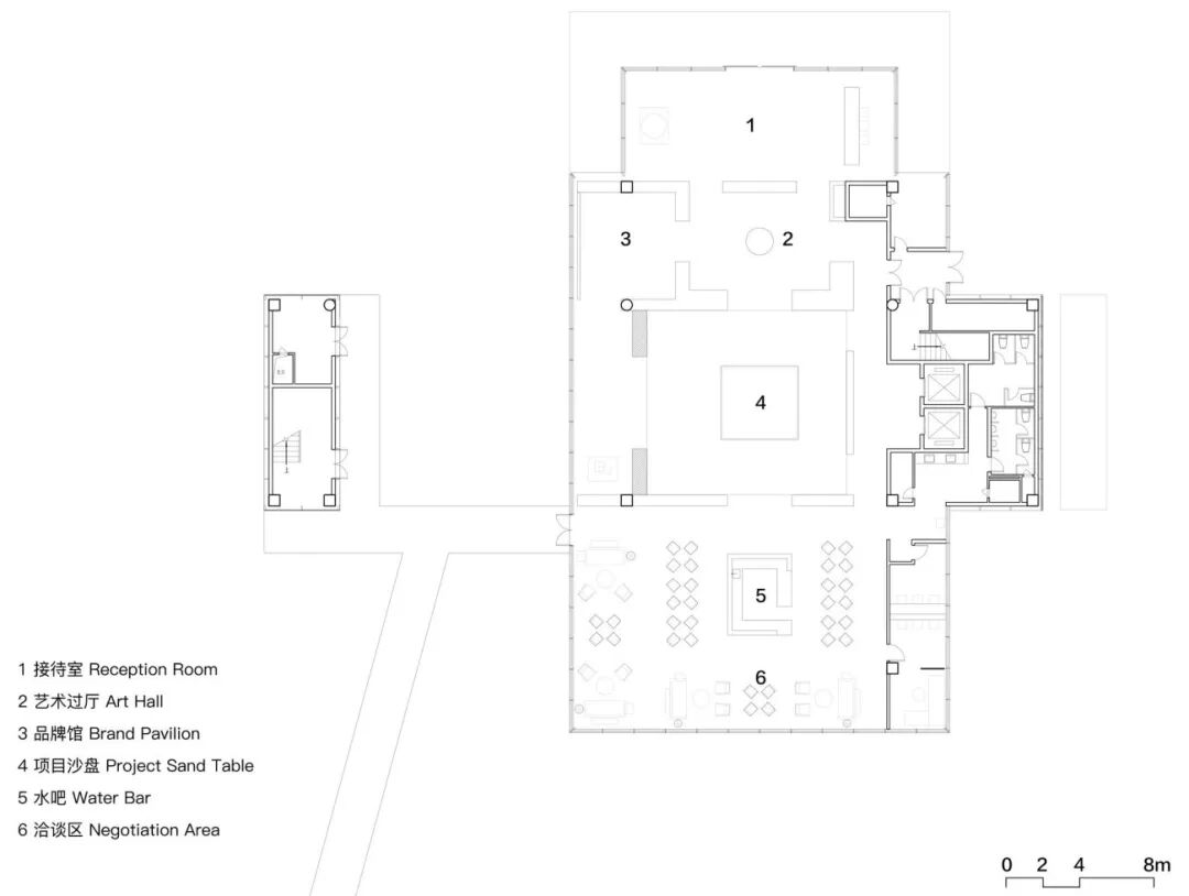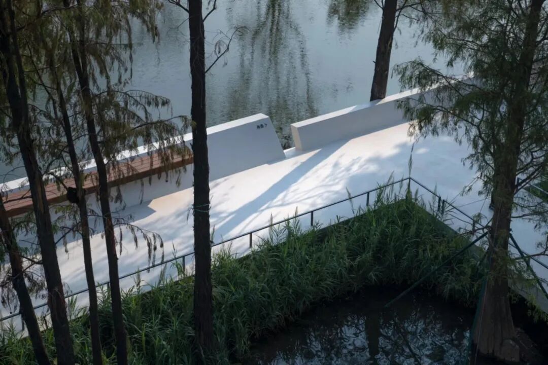 建筑顺应地形,依水而建,一层体量漂于水面之上,造亲水之势,三层体量浮于树梢之间,享云端视野,以现代的手法重现水乡生活意境,体现天人合一哲学内涵。立面水景飞瀑,从三层顺流直下,营造“源头活水”的空间意境,从视觉、听觉、触觉全方位营造独特的空间体验。