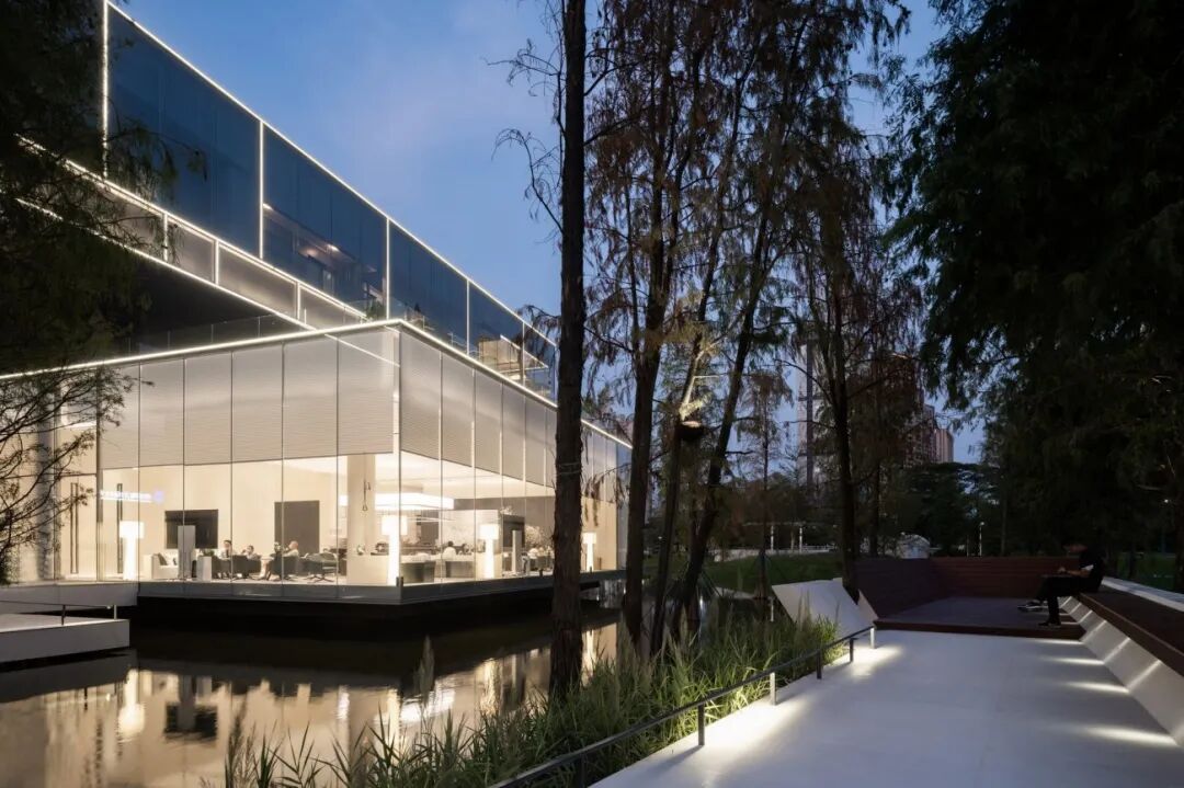 我们所希望表达的地域文化,不是传统符号的简单拷贝,而是基于当今城市文明的时代演绎。通过对桑基鱼塘传统记忆的提取,将水塘和田埂相互交织的城市记忆在建筑第五立面作了抽象演绎,体现农耕时代的城市脉络。通过清澈的景观水系,通透的玻璃立面,将天光云影溶于一镜,在城市中心营造乌托邦式的现代田园生活场景。