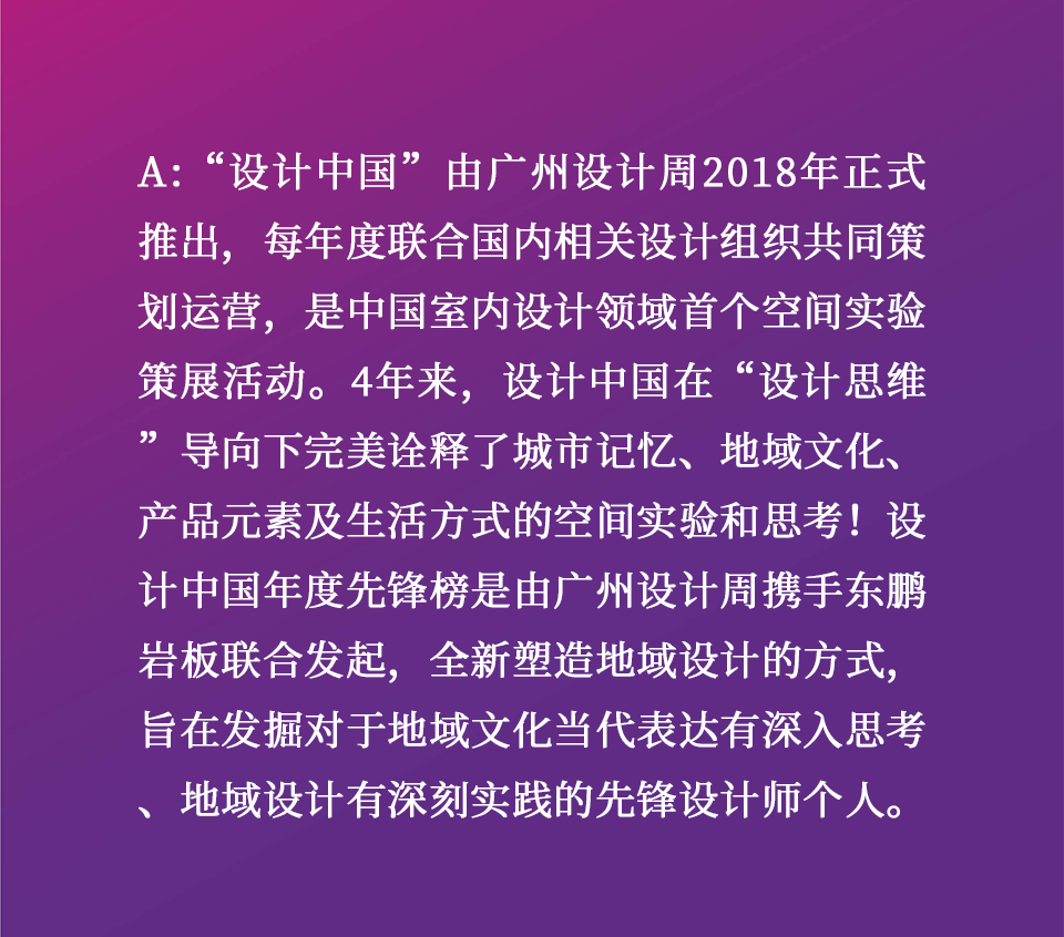 “设计中国”由广州设计周2018年正式推出,每年度联合国内相关设计组织共同策划运营,是中国室内设计领域首个空间实验策展活动。4年来,设计中国在“设计思维”导向下完美诠释了城市记忆、地域文化、产品元素及生活方式的空间实验和思考!