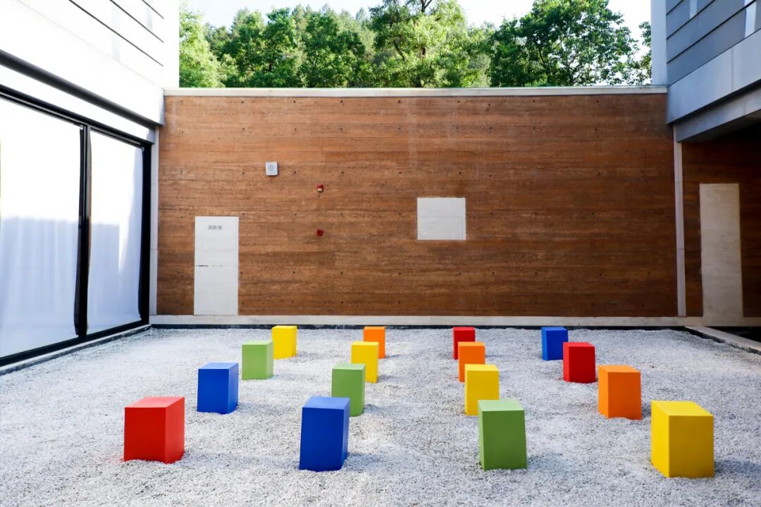 视线向室外延申,沙地上的色彩方块在与天空对话,波光粼粼的水面染上了颜色反射在墙头一角,喧嚣的色彩到了室外却陡然安静了下来,它们之间交头接耳的声音被吹散在天地的凝视与思索的气息中。