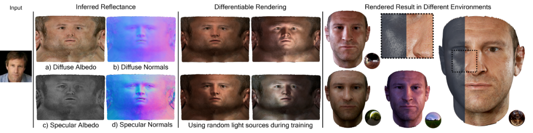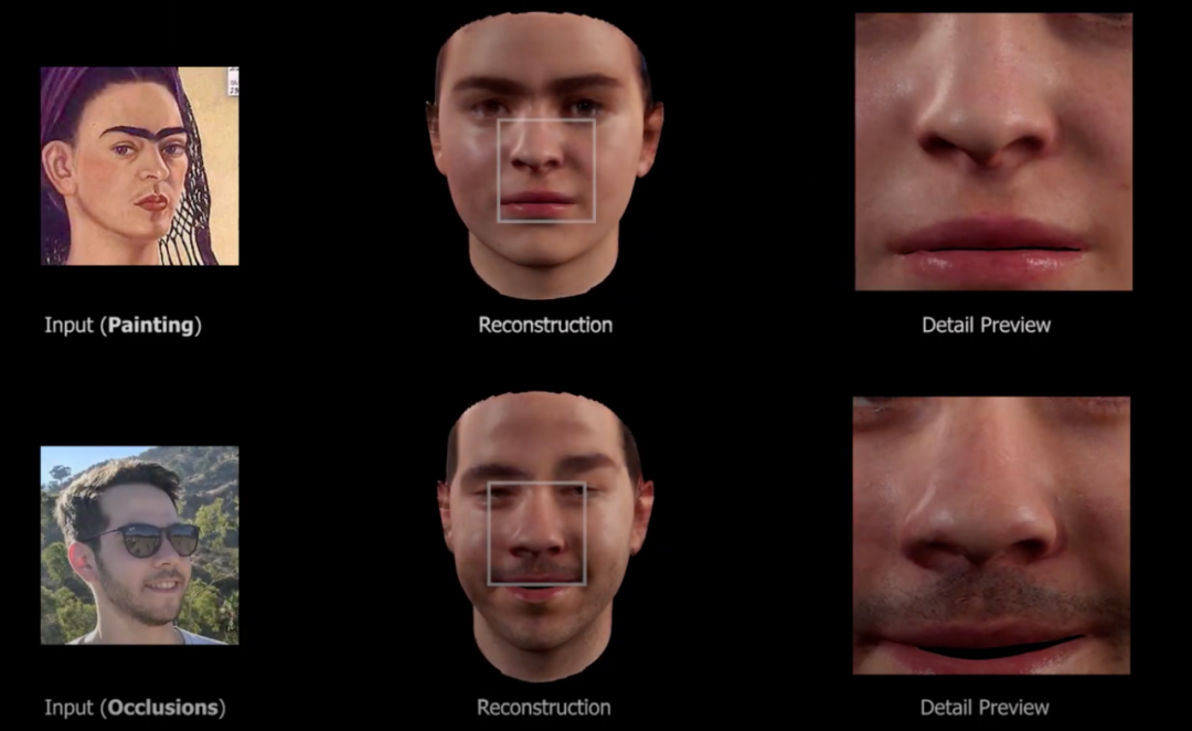 AvatarMe 也是可自动生成数字人模型的算法,输入信息可以是任何人脸图片类信息,包括相机拍摄的图片、绘画人像等。