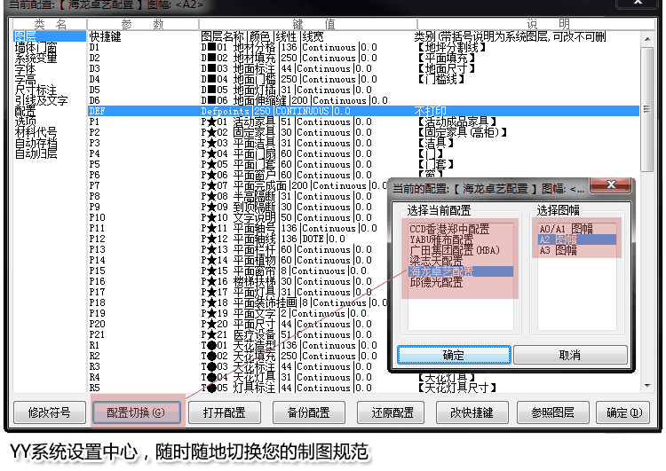 用户自定义制图规范,可同时存在多个设计配置,CG可一键切换到任意规范配置并执行绘图环境。