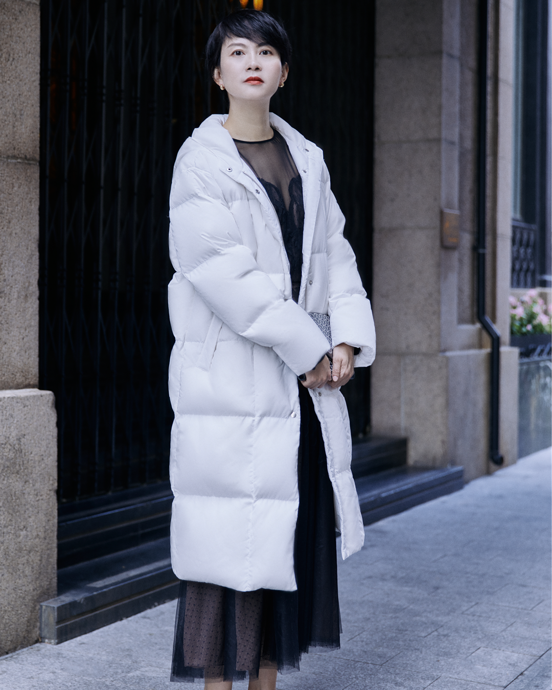 外表面是质感精良的哑光效果,抚摸的触感舒适惬意,廓形宽大,包裹在里面有种羽绒被般的慵懒。细节在不经意间呵护你,袖口引入西装袖口的“衬布”设计,隐藏在看不见的位置,防风保暖。