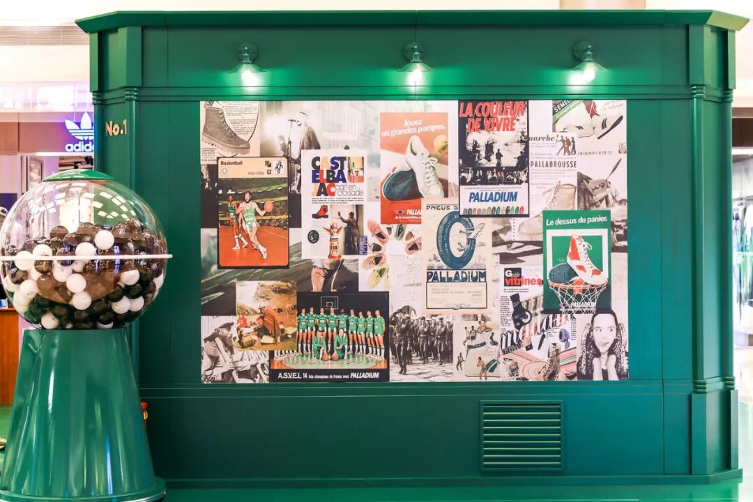 本次“面包屋”以“法式烘焙面包坊”为设计风格与灵感来源,店铺内外以复古邮差绿配色漆面,搭配经典木纹柜台,将 Palladium 的新款 PALLABLAST 面包鞋与法棍面包一同陈列布置,法式氛围感十足。