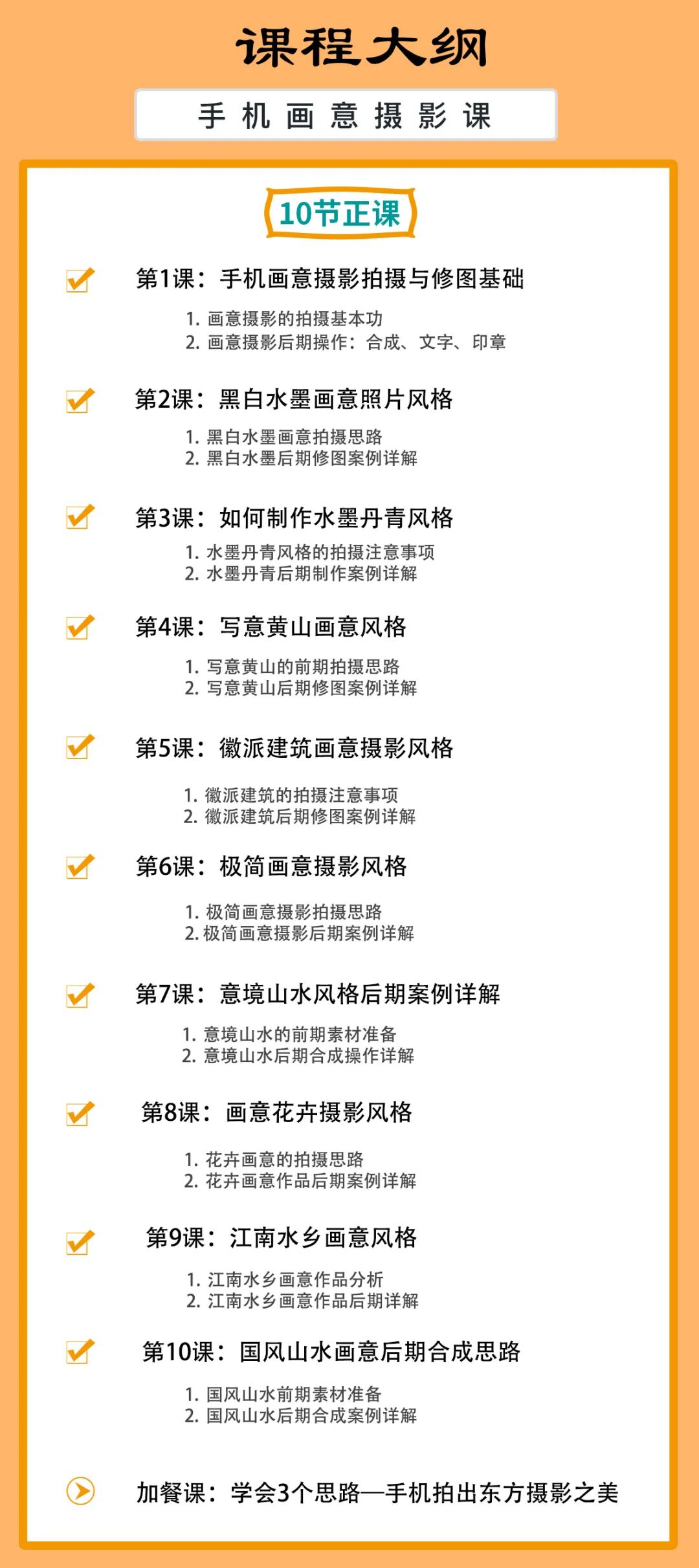 这门课程主讲10个画意摄影知识点:画意摄影的拍摄与修图基础、黑白水墨风、水墨丹青风、写意黄山、徽派建筑、极简画意、意境山水、花卉画意、江南水乡风、国风山水。另有一节加餐课,主讲用手机拍摄东方摄影之美的构图思路。