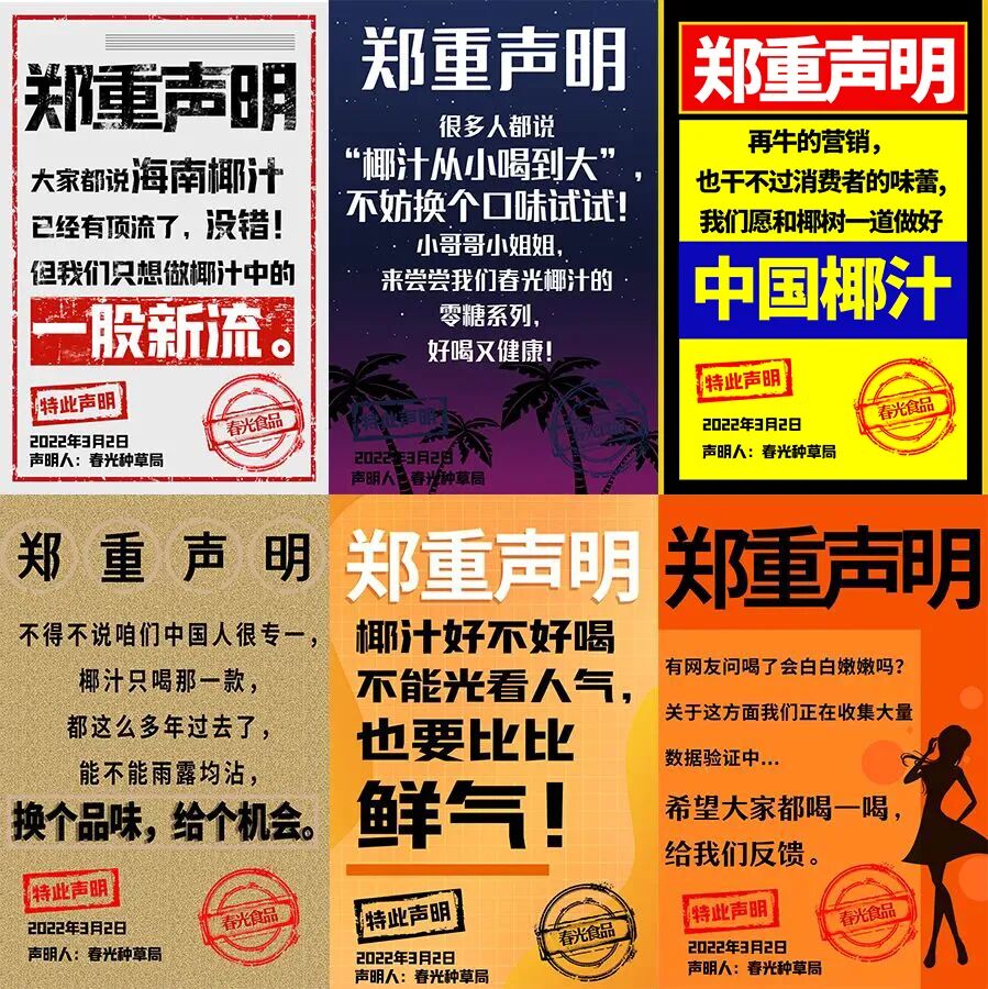 说实话,作为椰汁新品牌,春光要从椰树椰汁手中抢用户和市场其实十分艰难。但是看完春光椰汁的这26张郑重声明海报,还是很想购买春光椰汁尝试一番的。