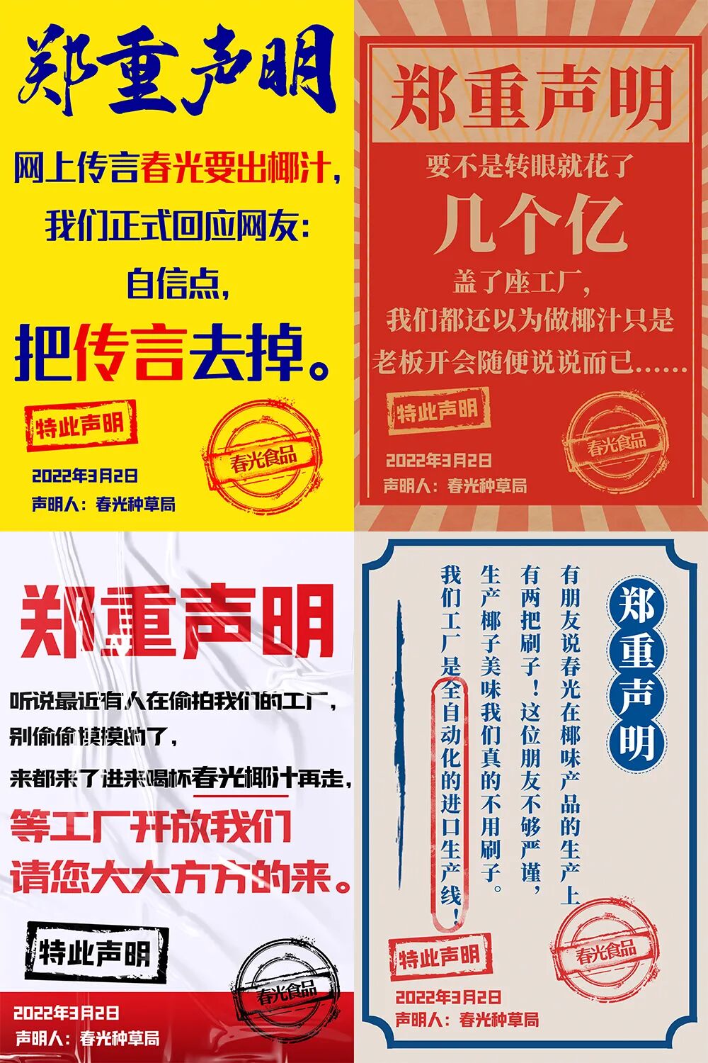 一时间众所纷纭、真假参半,于是春光食品于3月2日在官方微博和公众号一口气发了26张“郑重声明”的海报,正式回应此事。