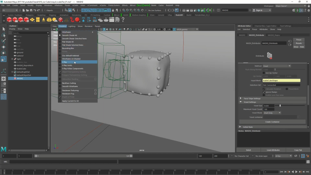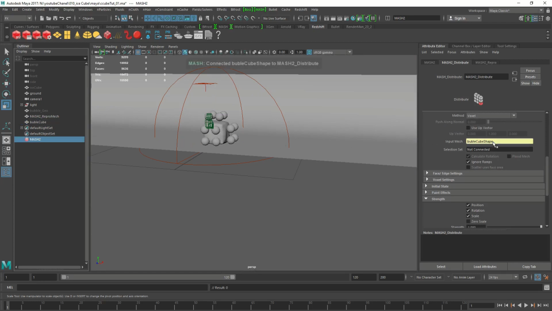 然后我们先将冰块立方体复制,把原来的冰块隐藏。在MASH2_Distribute选项下将Distribution Type设置为Mesh,下方Mesh选项的Push Along Normal设置为Voxel。将Outliner列表里的冰块立方体拖动到Input Mesh选项中。