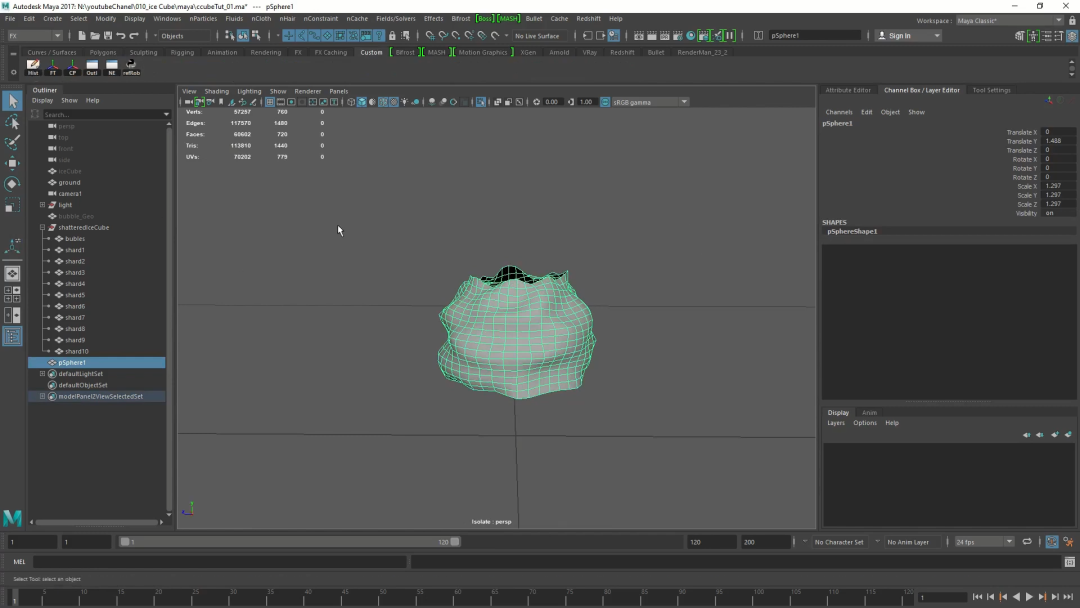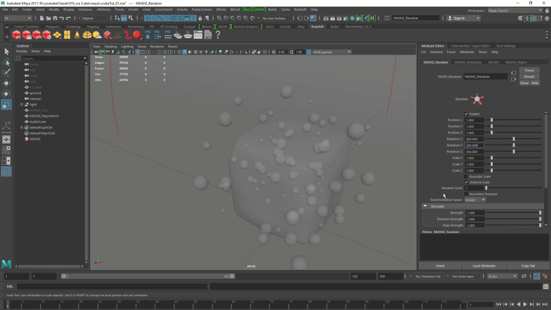 下面我们要在冰块内部添加一些小气泡,这里我们用一个Maya版本比较新的功能MASH。创建一个球体,在左上角将Modeling切换到FX,打开菜单栏的MASH→Create Mash Network,重置设置以便进行后续的操作的正确。