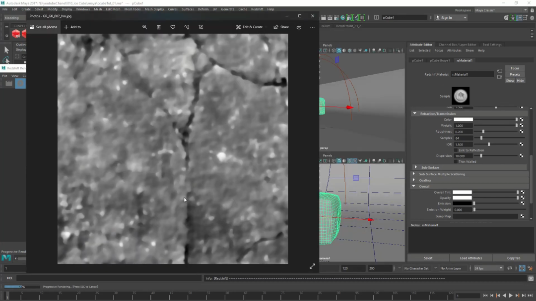 这些都设置完成后现在可以开始制作冰块的材质了,我们右键选中冰块模型为它分配一个redshift材质球rsMaterial,在预设(Preset)里选择Water,将Reflection下的粗糙度(Roughness)设置为0.2,Samples设置为64,IOR设置为1.5,然后将折射Refraction/Transmission选项下的Dispersion设置为10,取消Link to Reflection的勾选,然后在调整该选项下的Roughness为0.2,Samples为64。现在已经有了冰块的感觉啦,现在开始添加贴图~