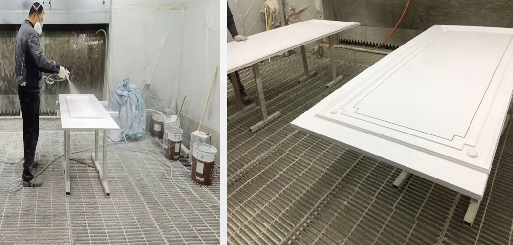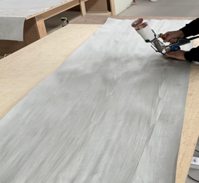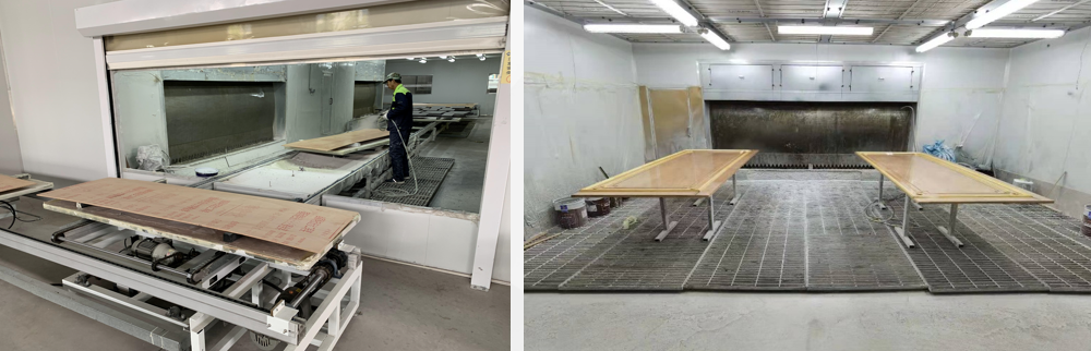 j、喷底漆:喷涂第一遍清油底漆主要用于封闭板材、填充毛孔和提高涂膜厚度,增加面漆的附着力、丰满度,全面有效地提升面漆的各个功能,保证面漆均匀附着,使整体效果发挥到最佳。