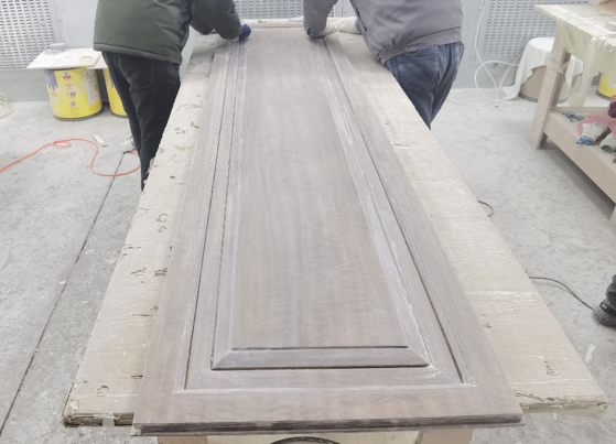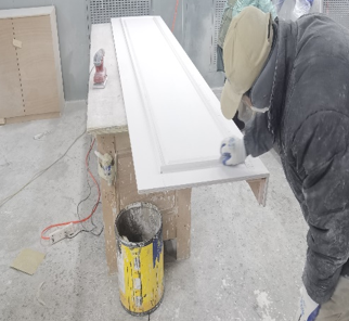 i、白培打磨:木工完工后,油漆工会对木制品进行上灰,主要修补木制品表面缺损、洞眼等。上灰成白坯后,油漆工用砂纸进行打磨,去除表面胶印、划痕、污染等,使之光滑。